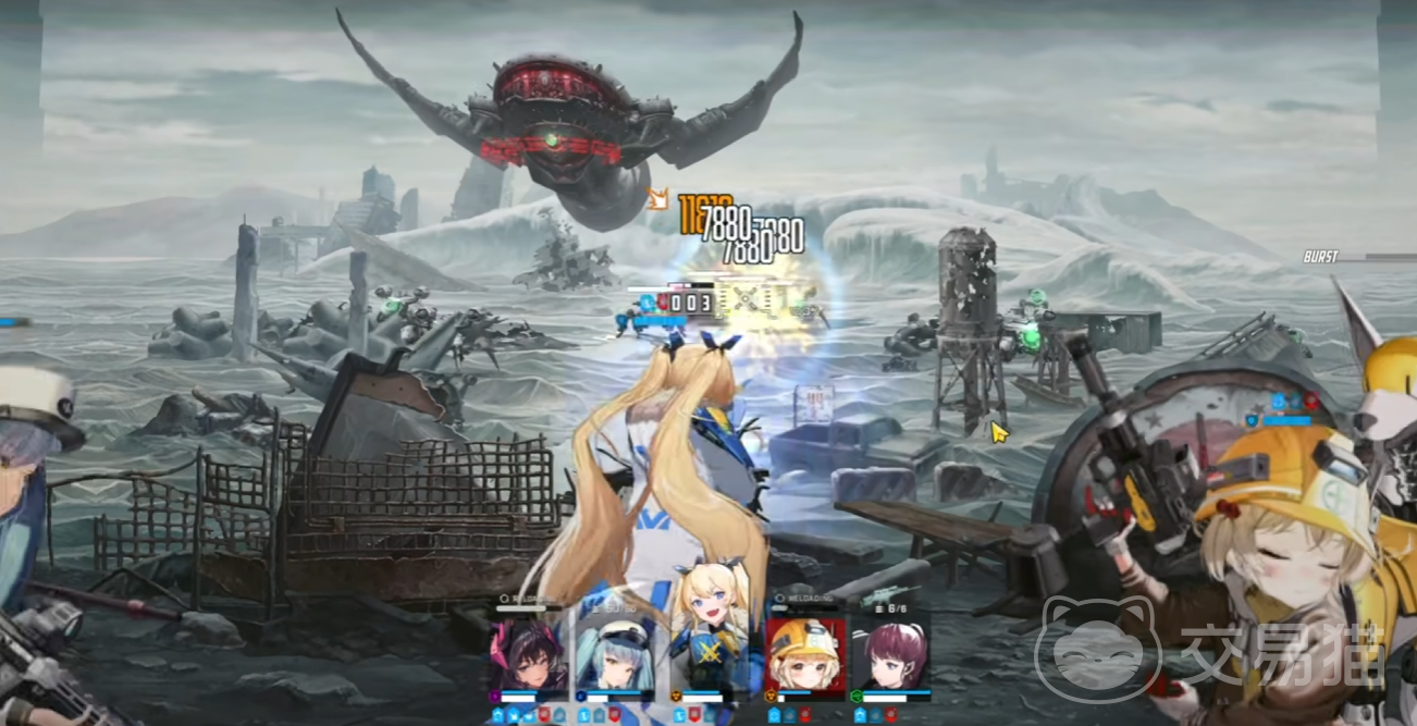 这个阵容的核心点是哈兰和初音,丽塔则是补掩体血量。开局大家要尽量在小怪出现前攒满爆裂,这样就不用去管第一波的小怪了,同时也需要注意boss眼球两侧的红圈,红圈出现代表boss就要攻击,在闪烁后必须躲掩体,因为这个攻击非常的痛必须躲。