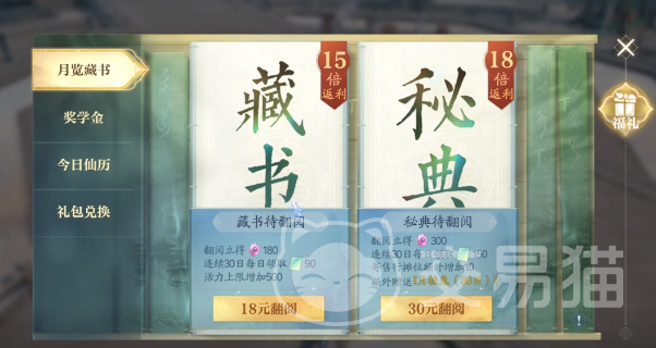 除此之外,玩家也可以选择购买阅览藏书、奖学金或者是今日仙历等等,通过这几种方法也可以获得所需要的货币。今日仙历这就相当于是每日礼包,玩家每一天都可以领取自己所需要的材料。