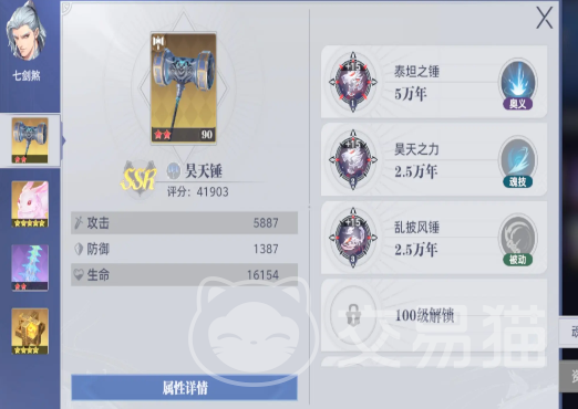 昊天锤的实力还是很不错的,攻击达到5887,防御达到1387。生命达到16,154,评分达到41,903。另外还拥有5万年的泰坦之锤,2.5万年的昊天之力以及2.5万年的乱披风锤,从多个方面来看确实都很不错,但一定要注重于正确的搭配。