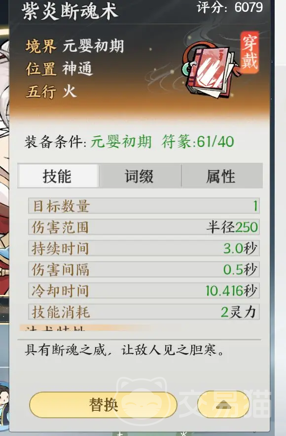 要是大家在副本中遇到一些水系怪物的话,那就可以使用一些火系神通,就能够造成更加高的额外伤害。例如紫炎断魂术,用了之后就可以对敌人造成高额的火属性伤害,如果搭配上其他火属性的神通,造成的伤害也会更高。并且还会增加气血,让你获得更多生存保障。