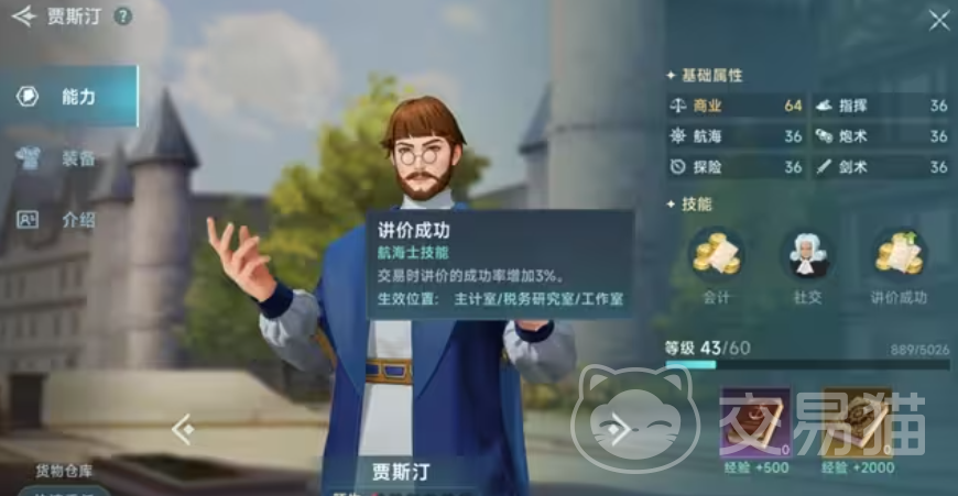 针对贸易型角色,玩家比较建议培养的是贾斯汀,他在游戏当中,可以提高玩家讲价成功的概率,交易时讲价成功率能够增加3%,不止如此,它的社交属性数值,也是游戏当中T0级别的,对于贸易战而言,是首选的一个副官角色哦~