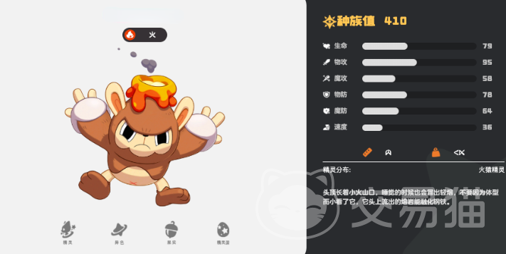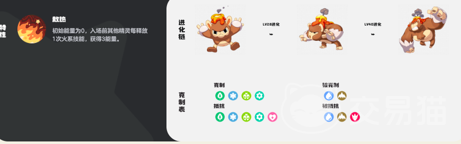 先来看看这个角色的外观造型,头顶一个可爱的小火山口,而这个火山口,就是他爆发技能的重要部位,作为一个火属性角色有着极强的攻击能力,可对草翼虫毒进行快速克制,他的初始种族值就高达410,而且到达28级和40级都可以完成再度的进化,它的特性为散热初始能量为零,每次入场前其他精灵释放一次火系技能,就可以获得三个能量,在团队当中有着非常好的叠加效果。