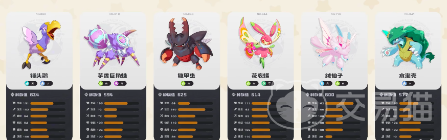 锤头鹳+芋香巨角蛛+铠甲虫+花衣蝶+绒仙子+水泡壳,整个队伍被称之为双核队伍,第一个核心是芋香巨角蛛,它的特性是毒腺,使用能耗小于2的技能时,会赋予敌方三层中毒,每层中毒则会造成3%最大生命值的伤害,换下场后则会清除,中毒效果是可以实现持续叠加的,不跟随精灵。配合湿润印记,每一层湿润印记都会给己方所有精灵的技能能耗-1。