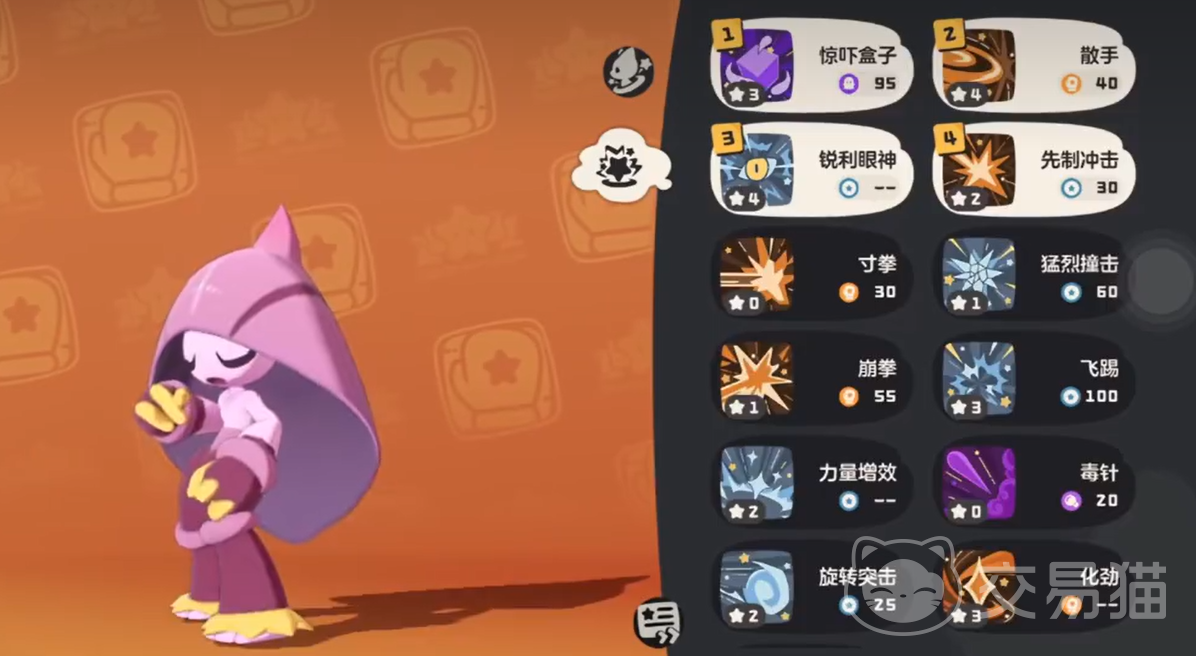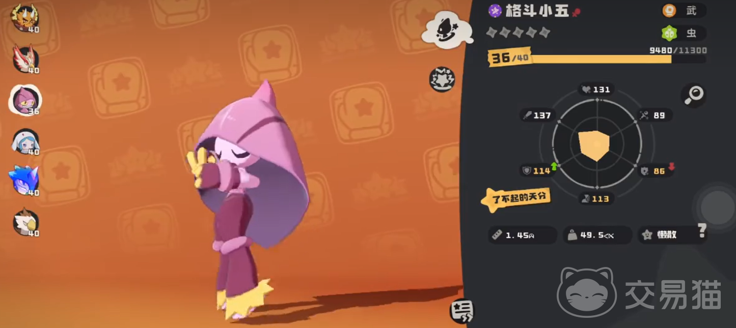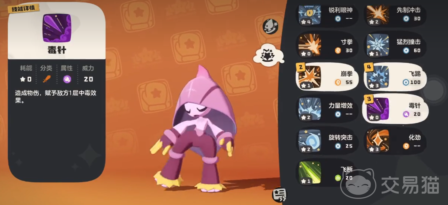 格斗小五的输出方式非常直接,几乎不需要花太多心思就能让它成为一名稳定的输出手。它的核心技能包括近身拳和炎爆拳。近身拳作为高威力单体攻击,可以迅速解决掉敌方的关键目标。而炎爆拳则是一个火系的范围攻击技能,专门用来应对草系或冰系敌人,打得敌人措手不及。想要在战斗中保持高效的输出,基本上这两招是必备的。