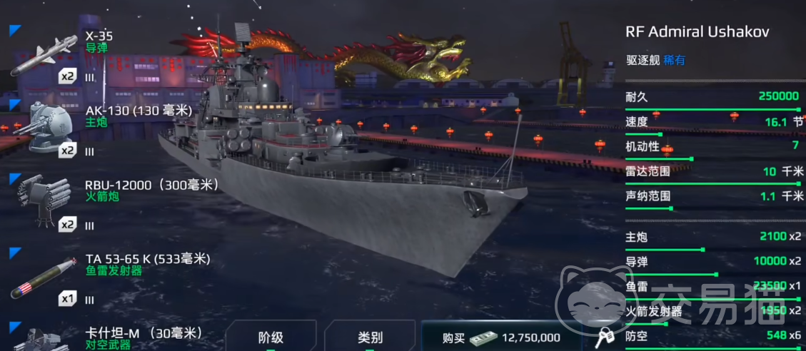 驱逐舰,特点是高机动性,适合快速突击和游击战术。可以搭载X51系列和东风系列导弹,具备强大的远程打击能力。机动性强,适合快速转移和规避敌方攻击。火箭炮配置优秀,近战压制强。劣势在于没多少鱼雷,水下打击能力有限。防御能力一般,需要依靠机动性规避伤害。