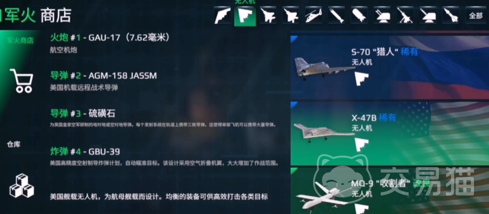 X-47B无人机,火力强大,适合远程打击。KUS-FS无人机,综合性能优秀,适合多种战术需求。猎人无人机,机动性强,适合快速侦察和打击。