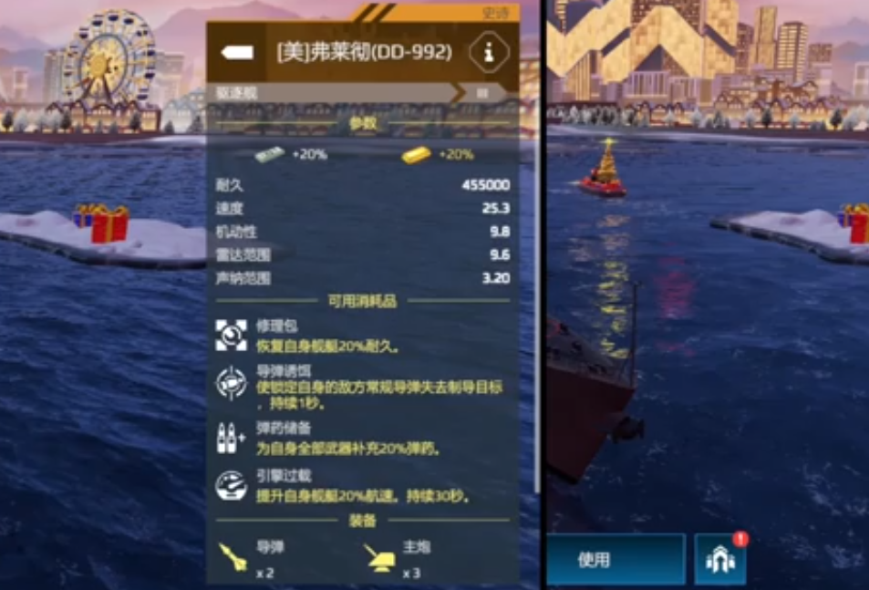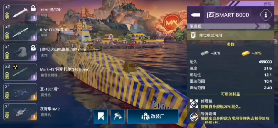 这是目前售价最高的驱逐舰,整体的数值自然也是非常的“超标”。机动性非常高的舰船,极速能达到30节,而且它的体型非常的小,行动起来就更加的灵活。它具备的锁定导弹提尔峰的性能也是顶尖的存在,如果配合灰鲭鲨就能打出非常恐怖的伤害。能装备CD短,但是伤害爆炸的电磁炮,还能装配2个自由鱼雷,可携带2架武装直升机设备,外加2CH1,在瞬间就能打出成吨的伤害;还可以装配2架直20变身反潜超人。不仅如此,它的防空能力也是一顶一的存在,血量也是比较可观,全方位的属性都非常在线,是全面全能型的舰艇。对于新手来说也非常合适,装备额外的配套设备,还能再提升战斗力。
