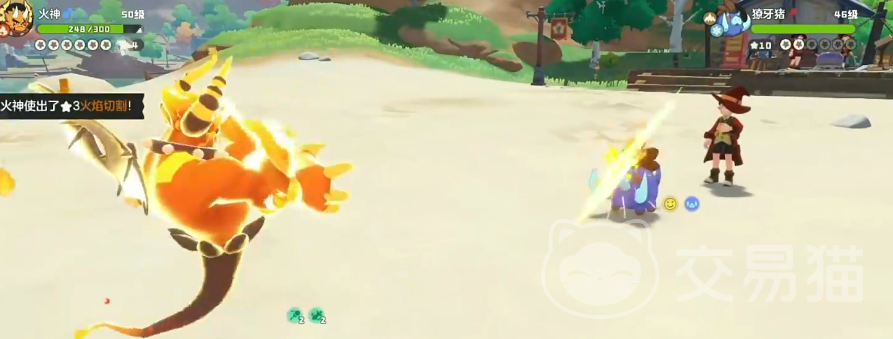 首战,对方拥有2点魔力值,全体属性是每个回合随机1个技能消耗减3,对方第一个精灵是萌+火属性的红绒十字,第二个是地+冰属性的獠牙猪,这边用火系的火神去打就可以了,火神在目前版本里还是很强的。