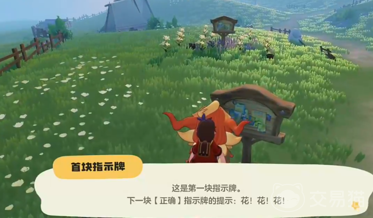 进入秘境后,需要我们按照顺序找牌子,这时可以先点左边的第一个牌子进行查看,然后这个牌子会给予我们第二块牌子花花花的提醒,所以我们直接点后方那个长在白花的牌子。