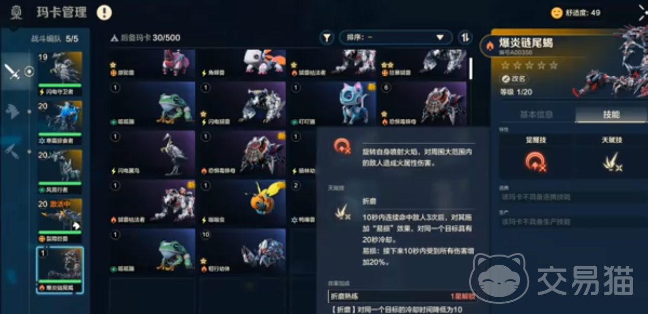 这是一只火属性的宠物,可以使用“螺旋火花”的觉醒技,能旋转它自己喷射火焰,可以对范围内的敌人打出较大范围的火属性伤害,并且有一定的概率点燃。天赋可在10秒内如果连续命中对手3次后,就能对敌人添加易伤的负面buff,后续10秒敌人受到的伤害都提高20%;这个易伤的效果其实很是关键,能显著的提高角色战斗时的输出能力,快速的结束战斗;主动技具备控制效果,甩动尾巴旋转攻击敌人。作为近战的玛卡,虽然移速不是很快,攻击频率也不太高,但是它的体型大,在场地比较小的战斗环境中发挥的效果还是相当不错的。