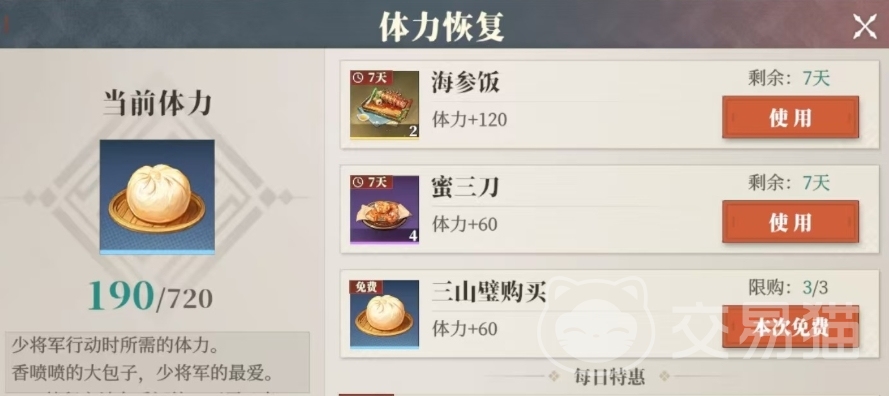 除了主线、进阶与觉醒副本外,玩家还需关注体力的恢复途径,体力会随时间自动恢复,玩家应时刻留意体力值,确保在体力满值时及时参与活动,避免浪费,此外游戏还提供了每天三次直接购买体力的机会,每次消耗三山壁即可增加60点体力,这为急需体力的玩家提供了便捷,同时玩家还可以通过使用海参饭、蜜三刀等道具来恢复体力,海参饭一次能恢复120点体力,而蜜三刀则能恢复60点。