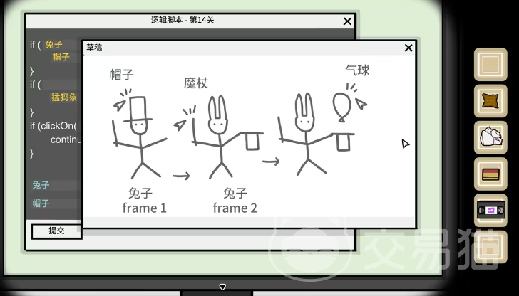 当剧情推进到这里时,小伙伴们可以看到右边的npc在向你招手,并邀请你帮他修复bug。玩家们点击他身边的显示器,即可看到在屏幕上出现了逻辑脚本的字样,同时还出现了一篇草稿,而这篇草稿中所包含的内容就是玩家们完成这一部分的关键了。首先.currentFrame判断的是当前的frame id,所以在这个空格中,玩家们能填入的只能是兔子。