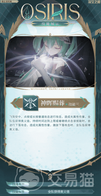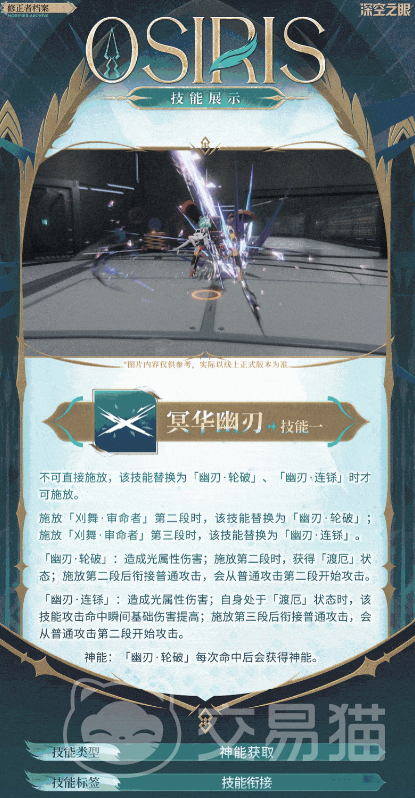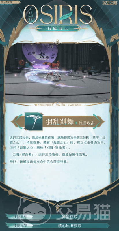 奥西里斯的技能总共有三类,第一个技能是普通攻击技能,她可以向前方释放出三段攻击,每一段攻击都属于光属性伤害,在第三段时,奥西里斯会释放一次“裁罪之心”,裁罪之心持续阶段,点击普通攻击技能,可以打出特殊技“沉鸣”,造成连续的三段光属性伤害。