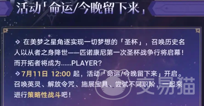 在联动期间,也会增设联动活动,联动活动的名称叫做“命运今晚留下来”,于7月11号开始,玩家就可以通过召唤英灵,解放令咒的方式,来展开数个策略性战斗,该玩法也是和fate的主要剧情将融合的。