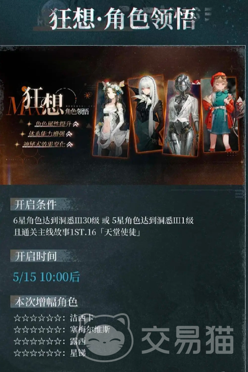 值得一提的是,如若玩家想要开启狂想玩法,则必须率先通关主线剧情故事,“1st16天堂使徒”才能够正式开启,并且只有当六星角色达到洞悉三层以及三十级时,才能够进入,同比,五星角色,达到洞悉三层的一级,也是可以进入的。
