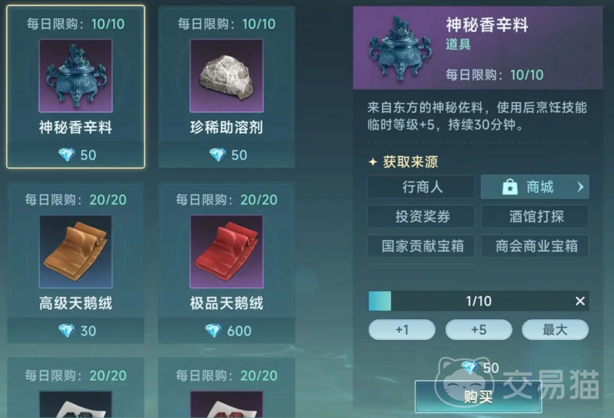 其中,最为关键的材料之一便是香辛料。香辛料是提升烹饪技能的重要道具,每天玩家都可以购买10个香辛料,每个香辛料需要花费50钻石。使用香辛料后,玩家的烹饪技能会提升5点,但持续时间仅为30分钟。因此,玩家需要在获得香辛料后及时使用,才能最大化其效果。通过使用香辛料,玩家可以制作出包括羊奶、鸡蛋、奶酪、腌肉等多种基础食材。