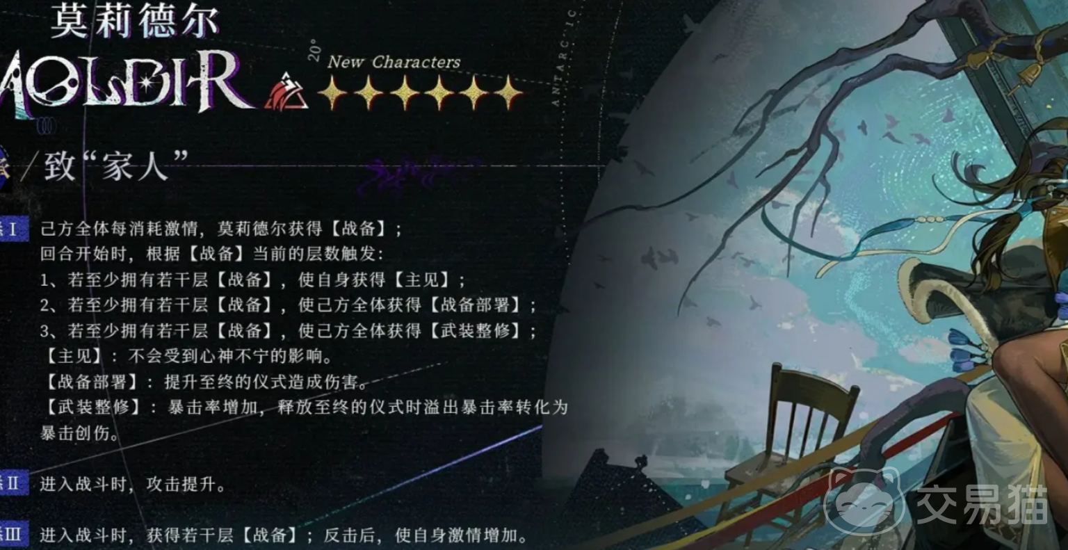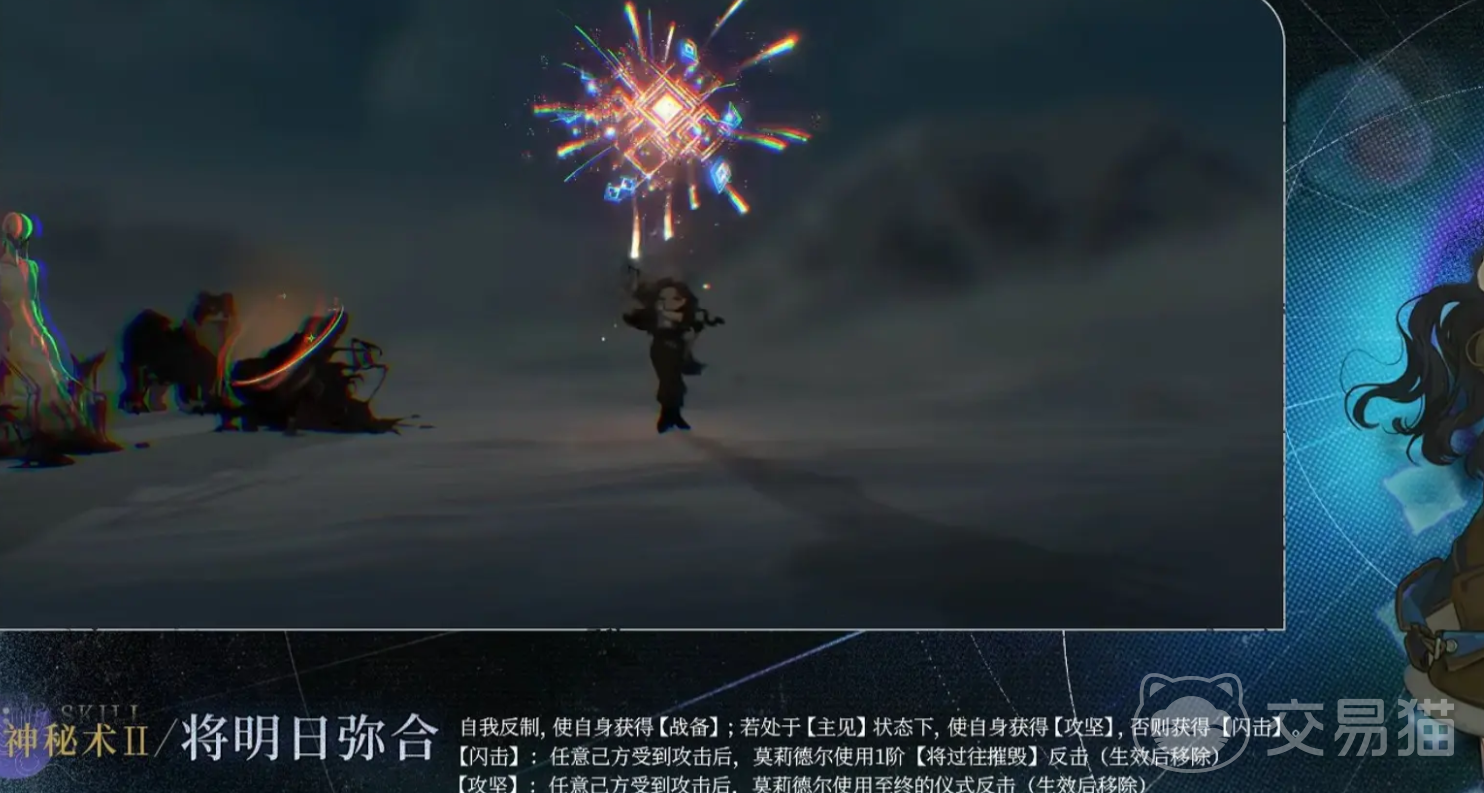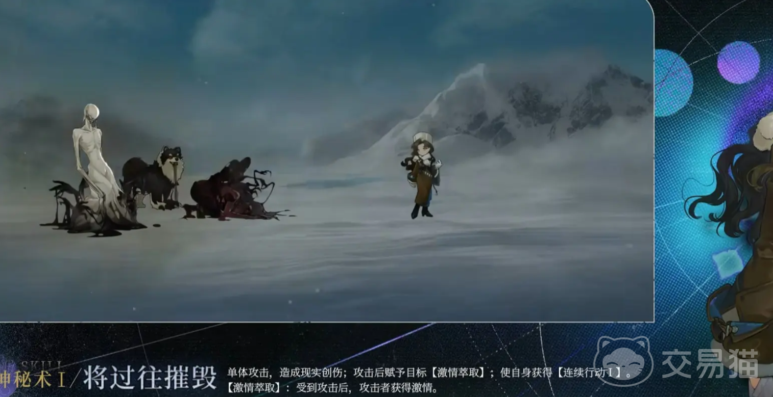 莫里德尔总共有三个技能,首个神秘术技能叫做“将过往摧毁”,在释放之后,可以对敌方单体目标,造成一次现实的创伤,并且对敌方赋予一层激情萃取的buff,该buff可以使得自身获取连续行动的机会,激情萃取效果可以在攻击时,直接窃取地方激情数值。