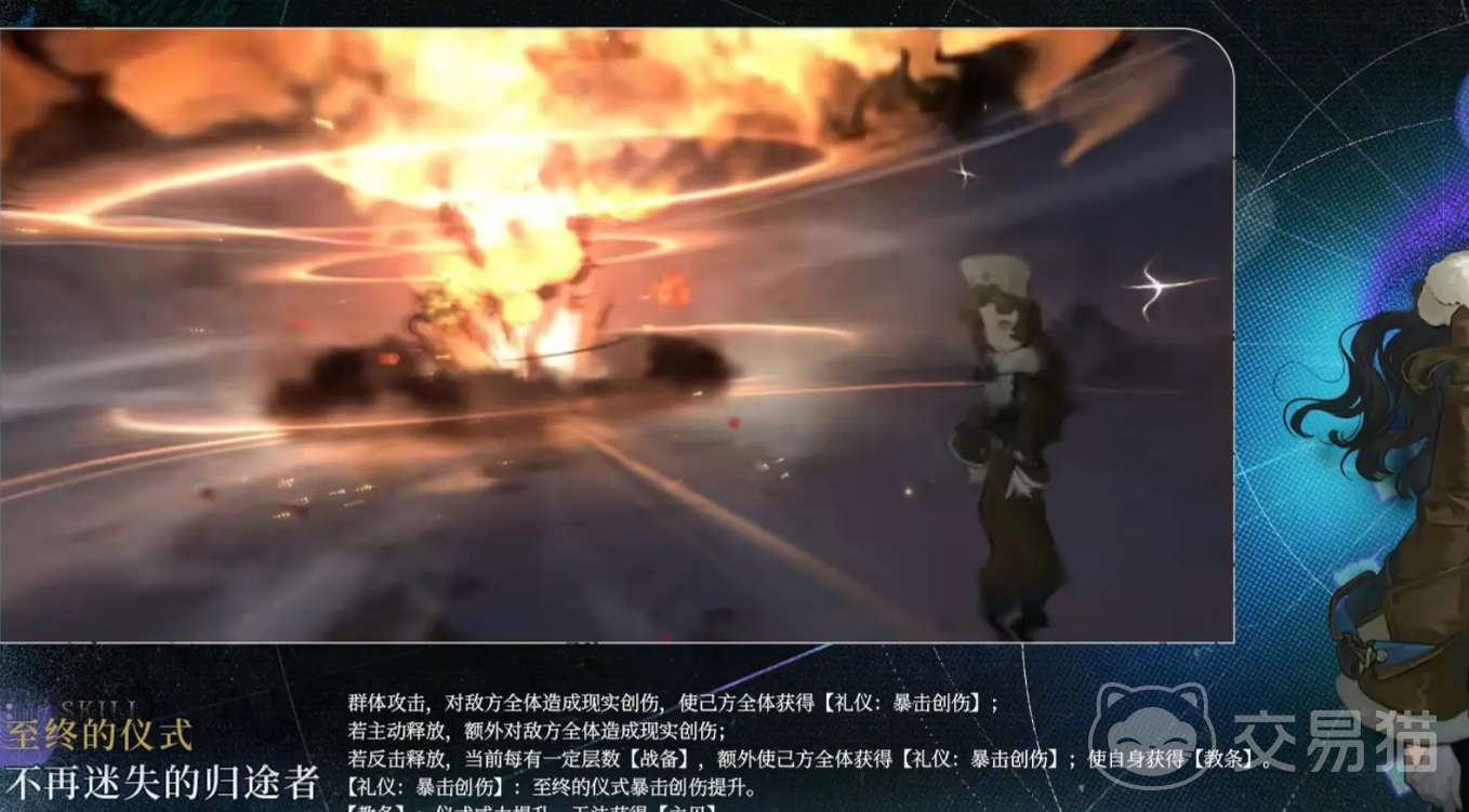 莫妮卡的最终技能为“不再迷失的归途者”,在成功释放反击时,她可以获得“教条”buff,无法再释放二技能,但是在反击后,她的仪式威力可以得到提升,让己方获取暴击创伤效果,并且提升下一位角色,释放仪式的伤害。