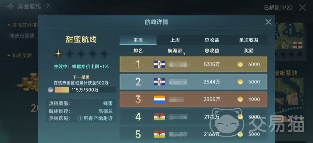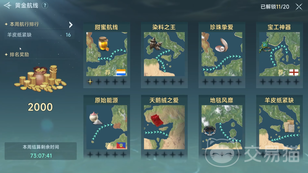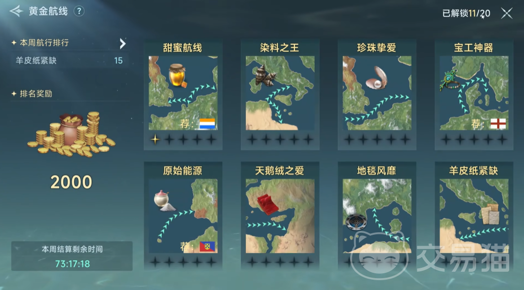 目前游戏里面有高达20条黄金航线,包括了七大海域,种类十分的丰富,黄金航线一共有5个星级,每个级别的要求都不一样,有的需要累积获益,有的需要单次收益,每完成一个星级,不仅能拿到一次性的钻石奖励,还能获得永久的台阶上线加成;排名靠前的玩家还能获得金币的奖励。