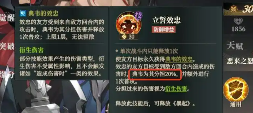 典韦的天赋技能“恶来之怒”进一步深化了他与绑定队友之间的联动效果。该天赋会在绑定队友血量下降时提升典韦的普攻伤害,在觉醒后还新增了“绑定对象阵亡后释放2~4次普攻”的机制。这一设定为他提供了爆发性输出的可能,在某些关卡中甚至可以通过牺牲绑定角色的策略,快速制造攻击窗口,击破敌方核心。