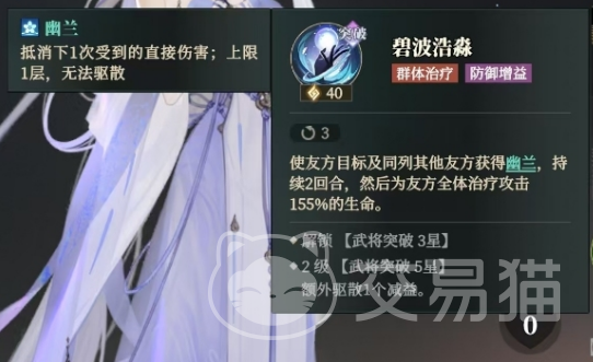 最后的突破技“碧波浩渺”,完全就是战场上的净化泉。不仅能让一整排的人都获得幽兰的保护状态,还能直接来一次全体治疗,按攻击力155%回血。她一个技能能做到保护+治疗两件事,别的奶妈得用俩技能才能勉强追平。