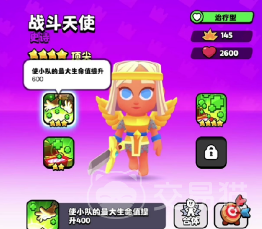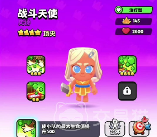 当战斗天使变成了三星的时候,他的属性加成可以提高到600点,这时候整个队伍的坦度将会得到很明显的提升。而战斗天使要是到了4星打开宝箱之后,他能够给小队的成员回复生命值达到700点,一旦合体之后就会高达1750点。不得不说这样的战斗力是毋庸置疑的。