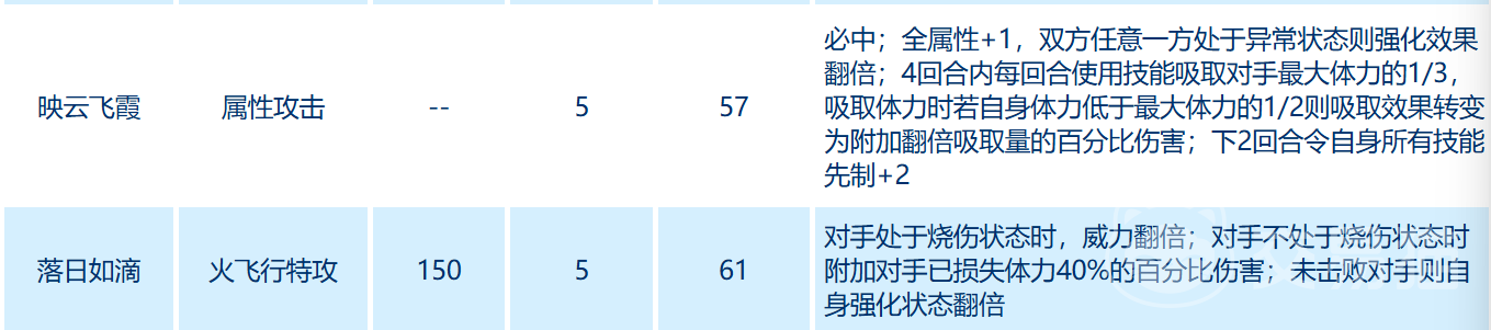 落日如滴是芙拉尔攻击力比较强的火飞行特攻技能,该技能的威力高达150点,战斗中该技能也是主要的攻击技能,若是敌人正好处在灼烧的状态,那造成的伤害还会直接翻倍,没有处在灼烧状态的话,则会附加上敌人已经损失掉体力40%的百分比伤害,没有把对手给击败的话,自身强化状态会直接翻倍。