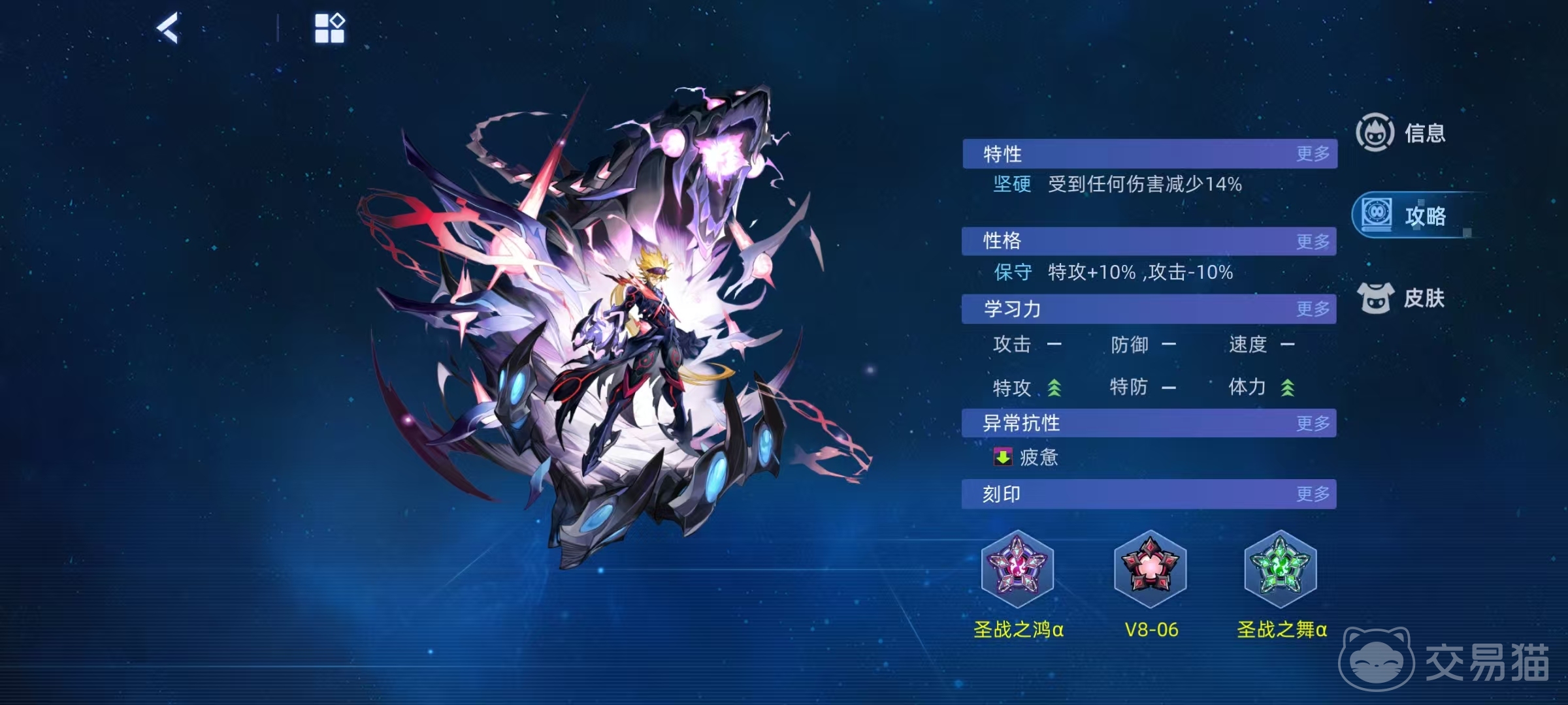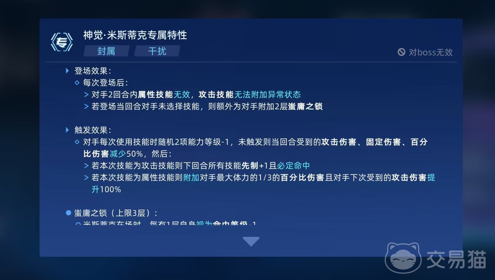 堕之盛响,能将对手的回合类效果消除,并且成功消除时,对手陷入疲惫状态,将自身全部体力消耗掉,下一只精灵获得消耗值50%额度的护盾与护照,为对手附加三层蚩墉之锁,己方免疫下一次受到的异常状态。王御影神罚,在攻击时造成的伤害不会出现微弱,如果克制关系为微弱,那么都将变成普通,还具有消除对手回合类效果的作用,对手每有一层蚩墉之锁,则对手随机一个技能pp值归零。