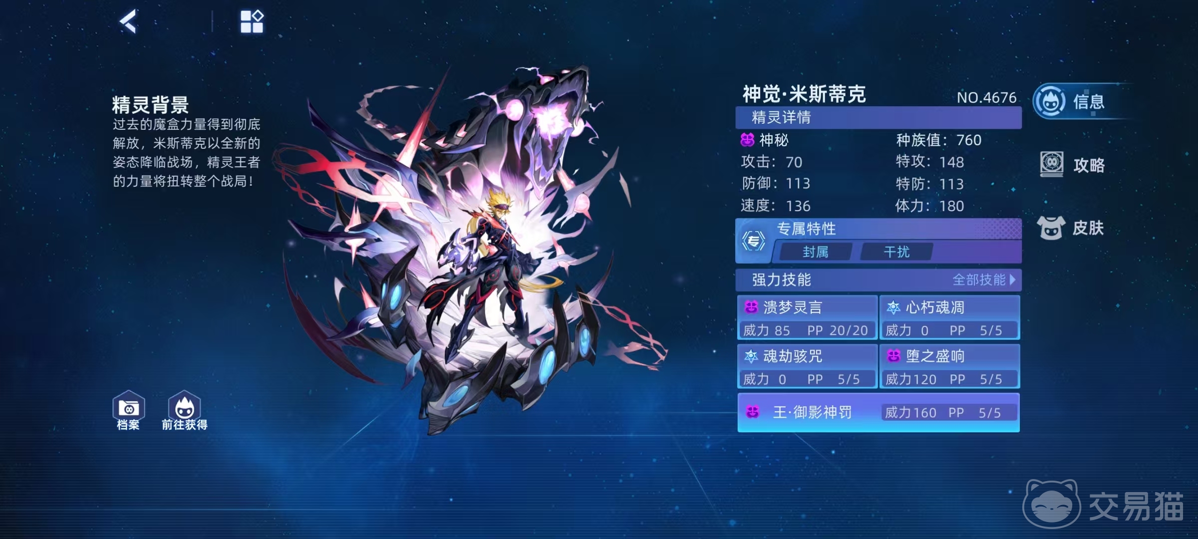 神觉米斯蒂克强力技能包括溃梦灵言、心朽魂凋、魂劫骇咒、堕之盛响、王御影神罚这几个。溃梦灵言,将对手身上的能力提升状态消除,如果消除成功会100%令对手疲惫,如果没有触发,按照自身最大体力值的1/3来回血。三回合内,对手使用威力不高于150的攻击技能时令对手疲惫,下两回合自身造成的攻击伤害翻倍。