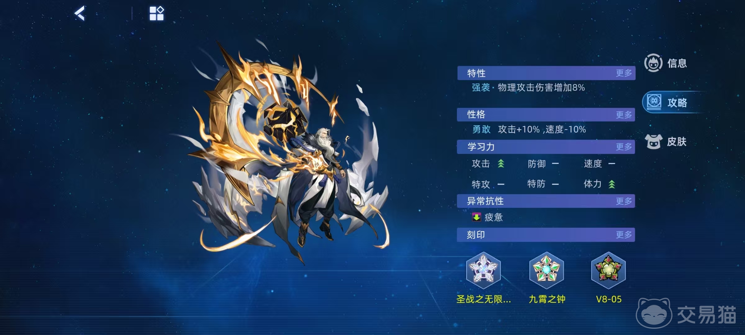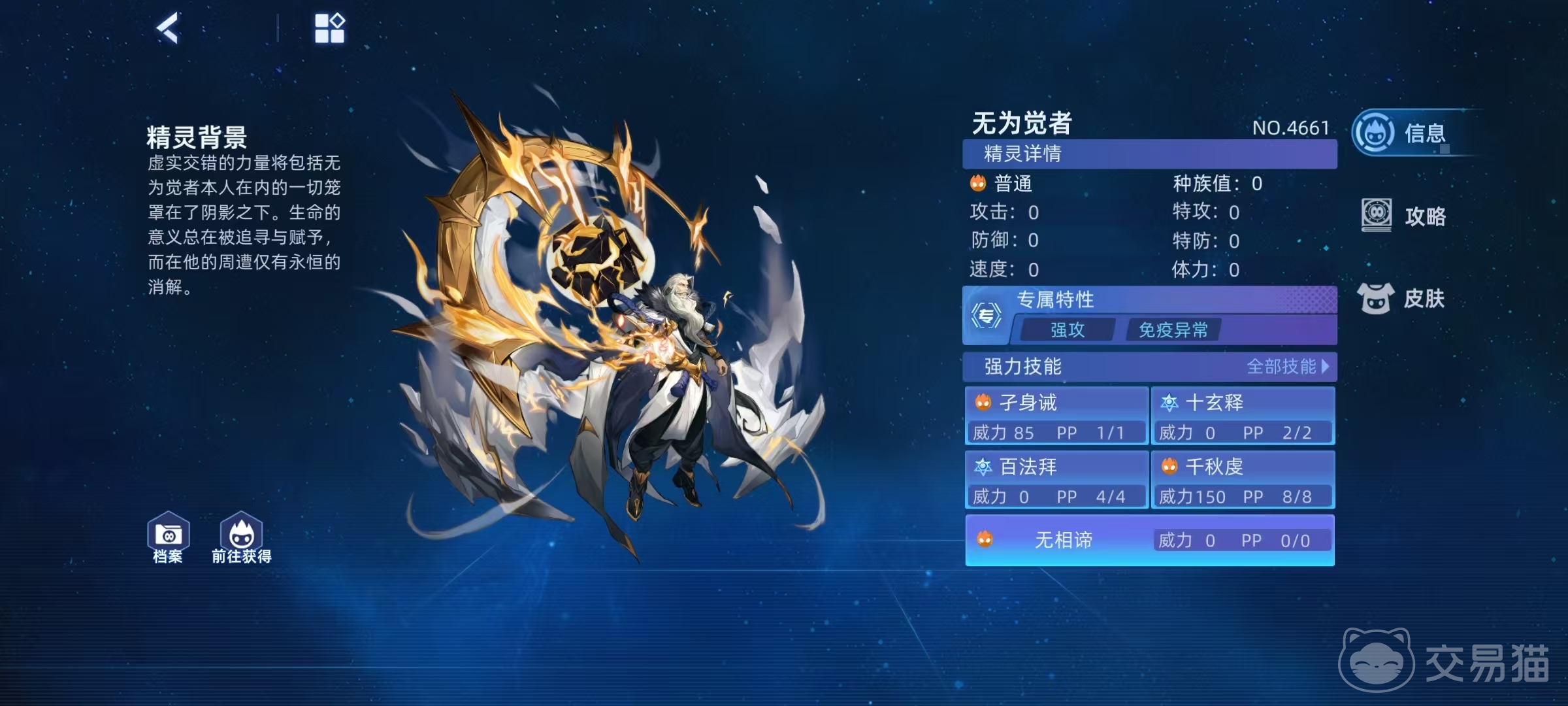 无为学者是属于普通类型的精灵,它的专属特性包括强攻、免疫异常等,可以通过精灵因子兑换的方式来获得。自身的主要技能包括孑身诫、十玄释、百法拜、千秋虔和无相谛这几个。孑身诫属于物理攻击类型,如果没有成功消除对手回合类效果,那么对手所有技能pp值直接归零。还能吸取对手能力提升状态,吸取成功后,对手所有技能pp值也会归零。100%几率降低对手所有技能1点pp值。如果对手的技能pp值为0,那么当前回合对手是无法行动的。