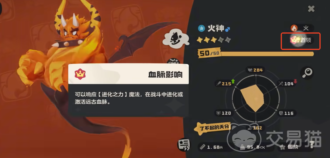 可以理解成一种特殊进化,需要先有这只精灵,并且培养到特定的等级,然后击败对应的精灵首领获得转化药水或者道具就可以首领化。首领化的精灵资质属性都有较大的提升,特性也不一样,通常提升幅度巨大。以大家最熟悉的莫迪为例,普通莫迪特性是每学会1个不同系的技能攻防提升5%,首领化的特性则是在此基础上额外附加光系技能威力提升20%。图中的首领化火神,其特性是释放火系技能后攻击力提升30,%,相较于基础形态多了10%。