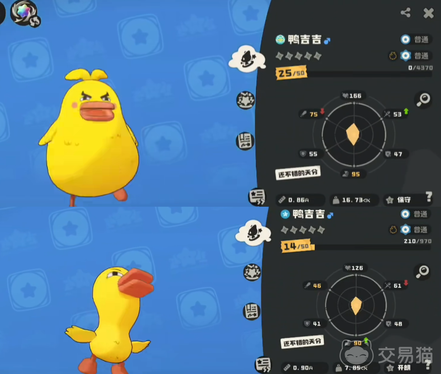 以鸭吉吉为例,肥肥的是一种形态,还有一种瘦瘦的,名字一样,天赋、技能、属性完全一样,就是长得不一样。