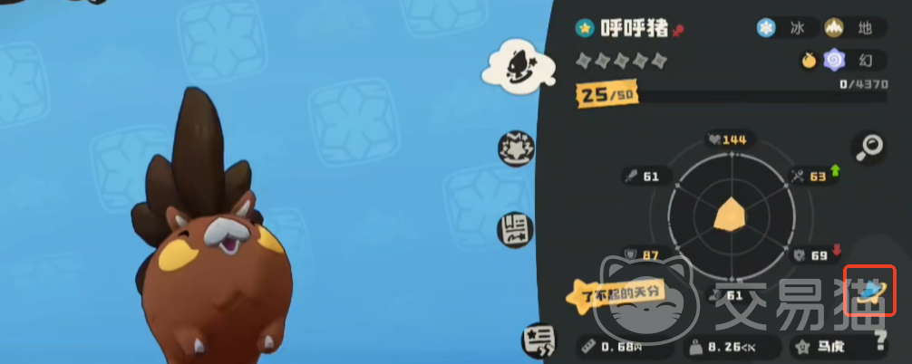 可以看到图中右下角有一个像陀螺一样图标,这表明这个精灵就是异色。异色精灵是没有正常办法可以获得的,只有活动给。通常是一周或者半个月一次的异色精灵活动,通过活动去抓捕得到的精灵就百分之百是异色的。异色精灵只是颜色不一样,技能其实没有什么变化,属性也都一样,