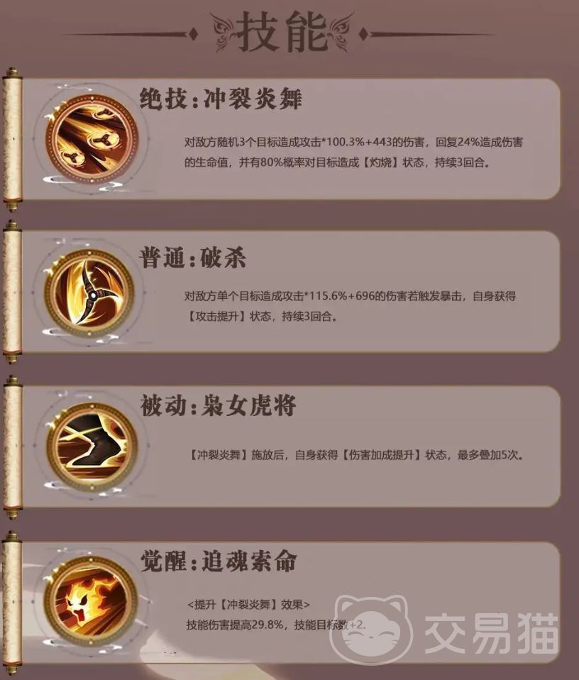 其中祝融夫人的冲裂炎舞这个绝技是核心的输出技能,该技能一旦施展之后,就可以给随机的三个敌人造成高额的伤害,还能够对目标施加灼烧的状态,这个状态可以持续三个回合,这样的话能够保证他的输出能力,另外也在一定的基础上保证了续航能力。毕竟祝融夫人在战斗的时候他能够持续性的作战。