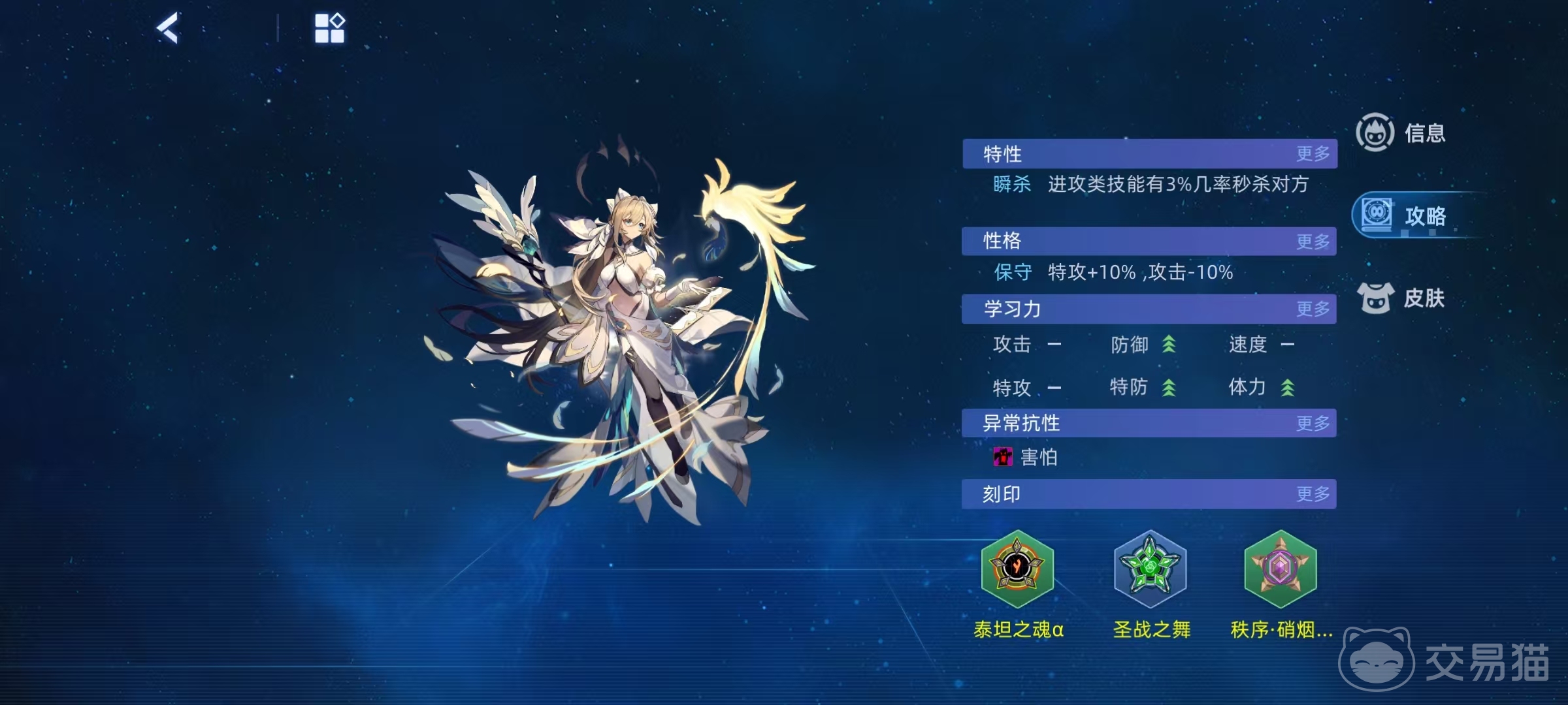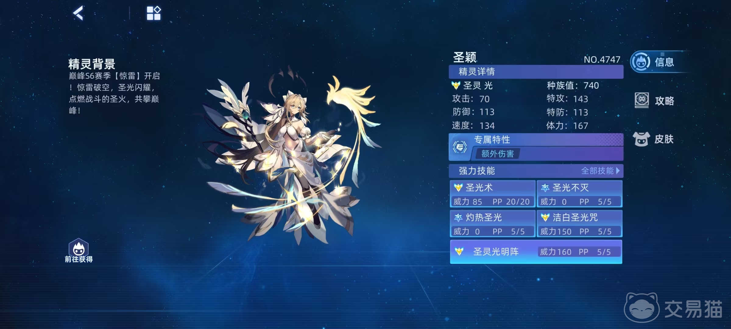 圣颖是大家通过惊雷赛季可以获取到的精灵,在获取方式方面,和大多数精灵就有着一定的区别。它自身是属于圣灵和光这两种属性,种族值方面体力比较出色,特攻和速度也较为优秀,它的专属特性是额外伤害。战斗结束阶段,如果对手体力低于1/2,两回合内造成固定伤害和百分比伤害提升效果,如果此时自身的体力过低低,效果翻倍。在回合开始时,若对手体力高于1/2,则本回合自身使用攻击技能时附加百分比伤害,如果自身也高于半血,效果翻倍。