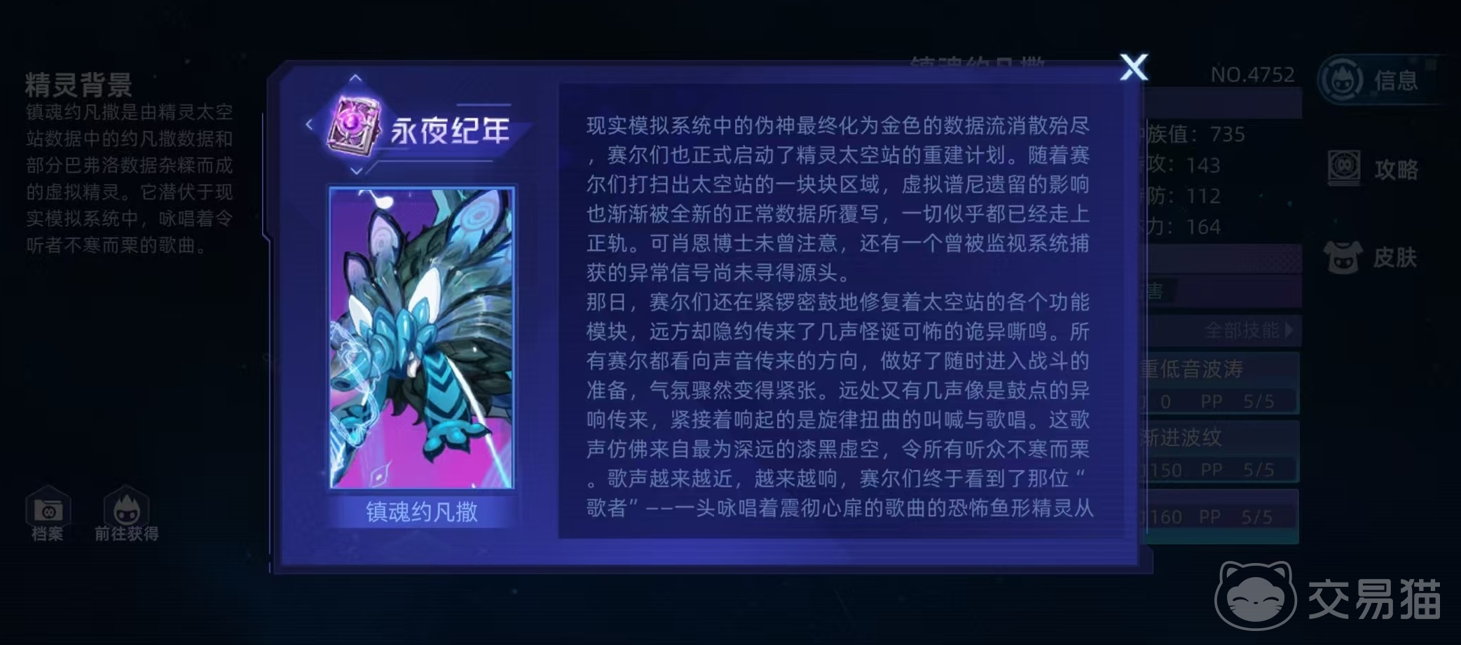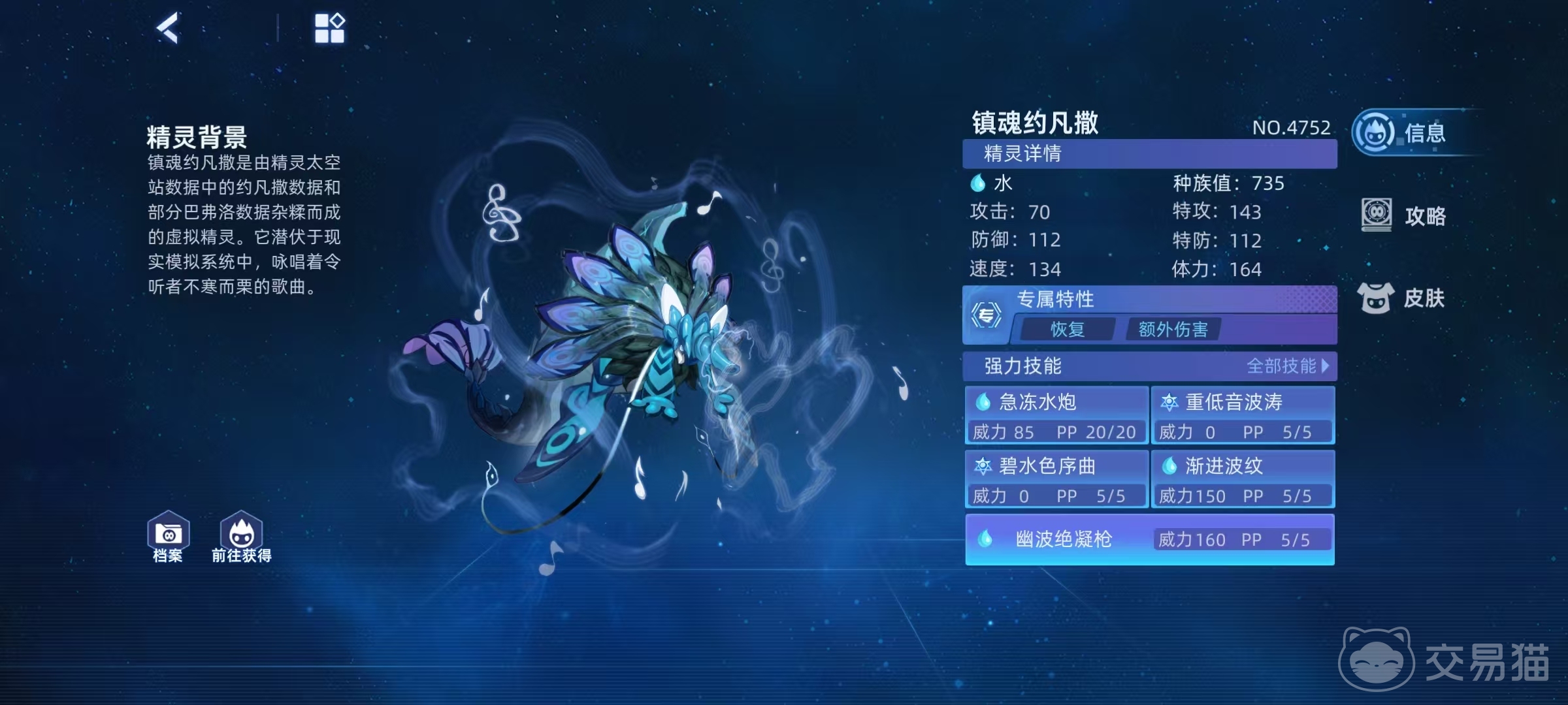 镇魂约凡撒属于水属性的精灵,它自身在特攻、体力等方面比较有优势,主要的特性有恢复和额外伤害这两类。它自身使用攻击技能时可令对手冻伤,如果对手已经冻伤,增加冻伤回合数。在战斗阶段结束时,如果对手所处的冻伤回合数达到五回合,那么下回合所有技能将附加额外伤害,如果小于五回合则恢复自身体力,下回合攻击技能必定打出致命一击。