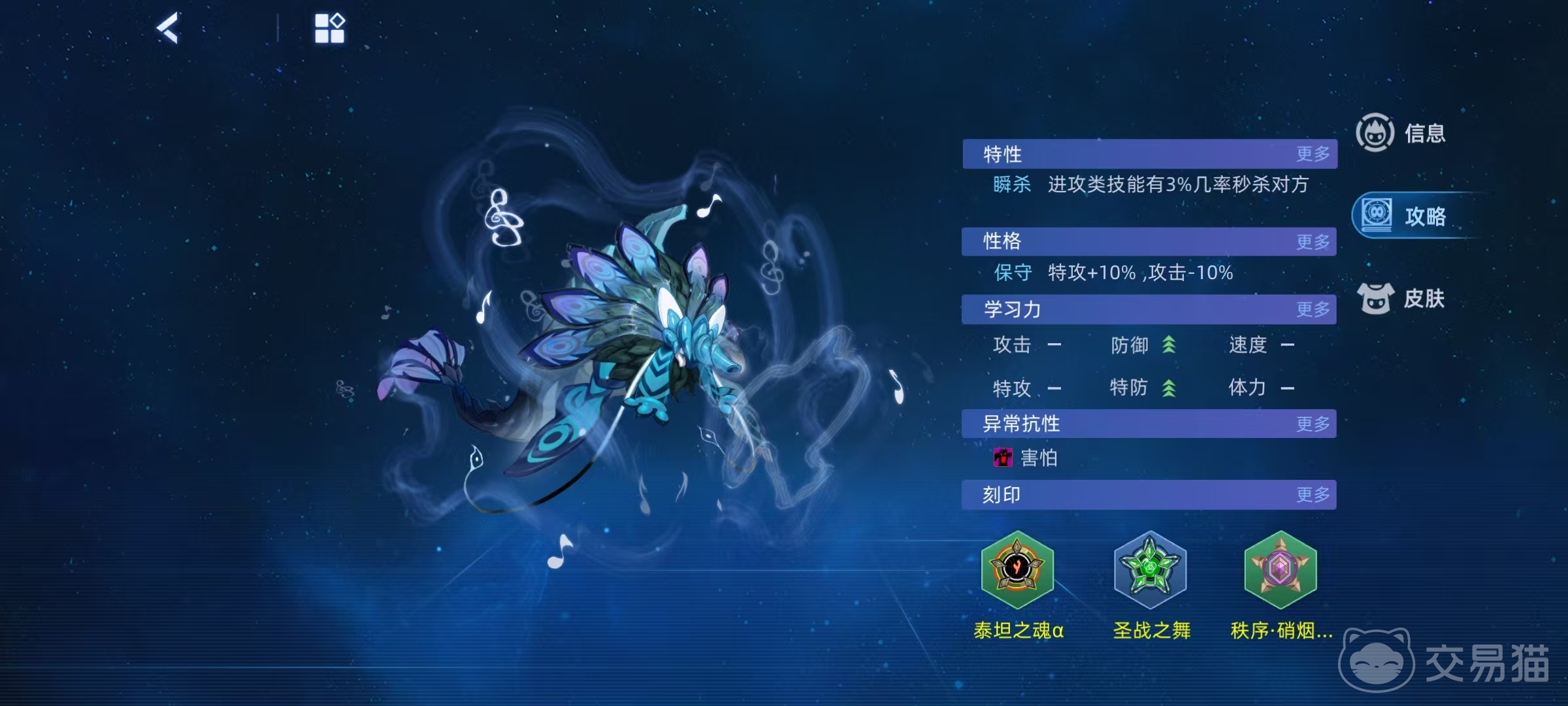 渐进波纹这个技能连续使用时,每次可增加30点威力,最多增加到。150点,如果造成的攻击伤害高于300,则对手两回合内使用属性技能无效,自身三回合内,免疫低于300的攻击伤害。为了展现出这些优势,大家在选择特性时可推荐瞬杀,有几率秒杀对方,性格方面保守最出色,增加10%特攻,降低10%攻击,学习力方面防御和特防最关键。