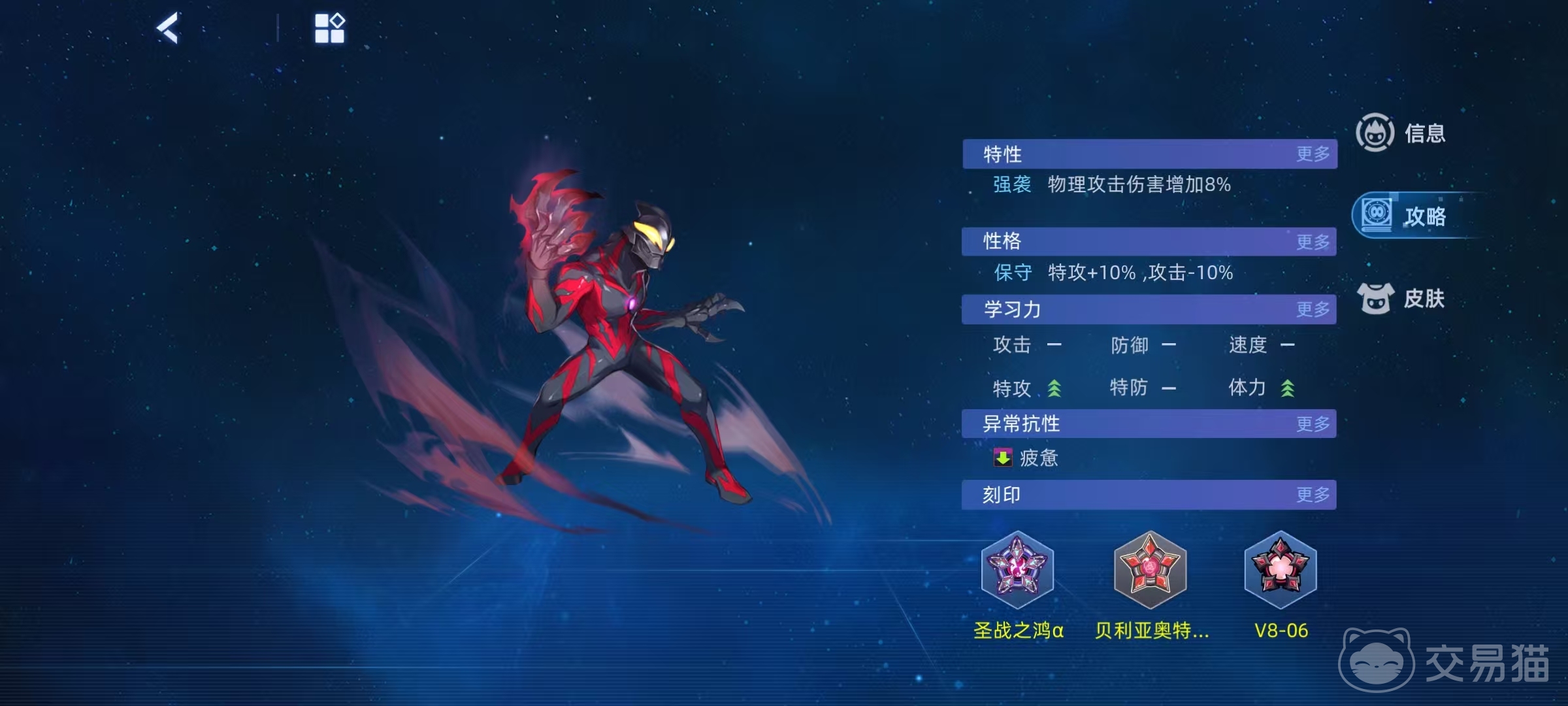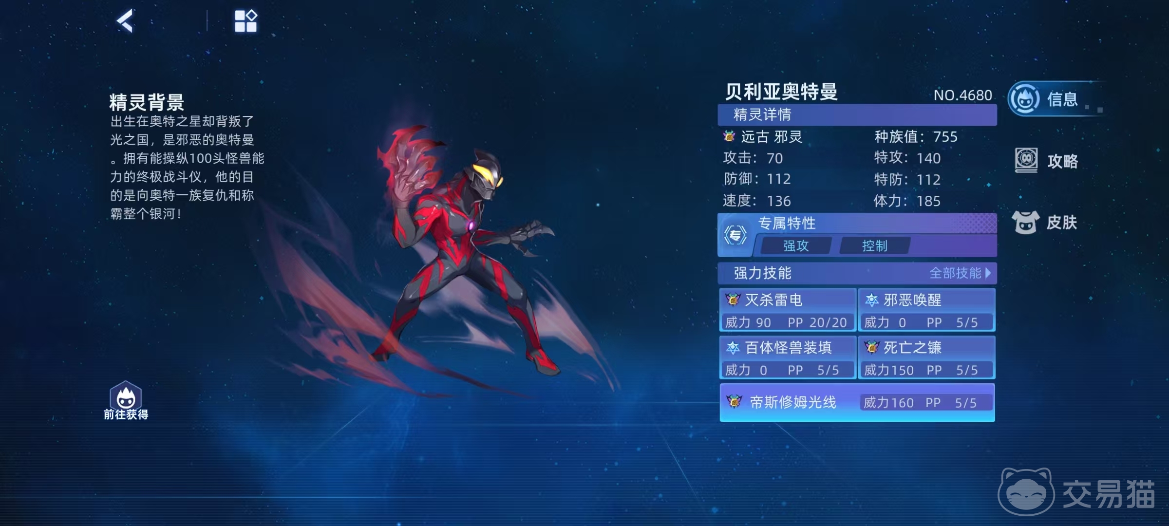 贝利亚奥特曼是属于远古邪灵,它的专属特性为强攻和控制,每次登场时都会为自身附加三种属性诅咒,之后每进入到控制类异常状态,就会转化为两回合诅咒。在种族属性方面,体力185极为出色,是当前体力最高的精灵之一,速度136,特攻140,这些也非常有优势。在主要技能方面,包括灭杀雷电、邪恶唤醒、百体怪兽装填、死亡之镰和蒂斯修姆光线等。