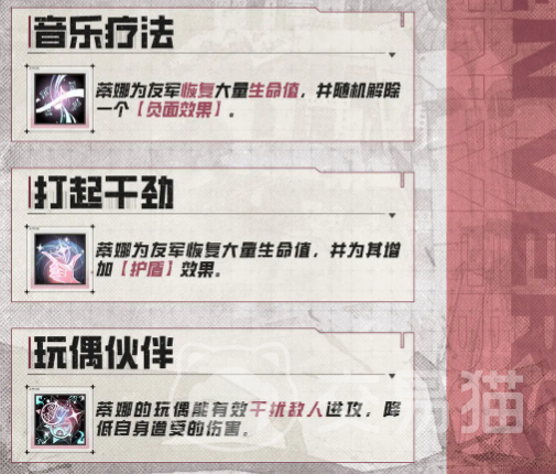 在小队伍中,这就是一个统一角色。蒂娜的技能主要是围绕治疗队友,例如中间会有一个音乐疗法,可以给有方的成员更快的恢复生命值,并且还可以解除负面的效果。打起干劲这一个技能不仅可以回血,而且还可以给队友增加护盾,就仿佛是增加了一层铠甲一样有效抵御敌人的工具。