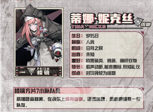 蒂娜出生于一个普通的家庭,小的时候对于音乐就已经充满着热爱,不过因为一场家庭的变故导致生活的轨迹出现了明显的变化。后来在经过米兰达的引荐之后,选择加入到小队中,走上了一段守护众人的旅程。