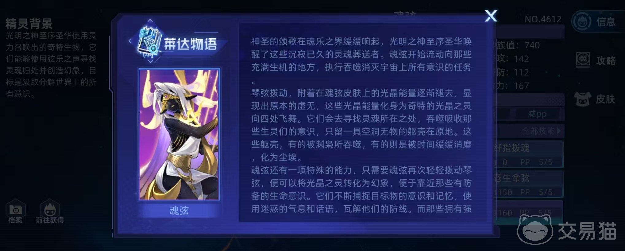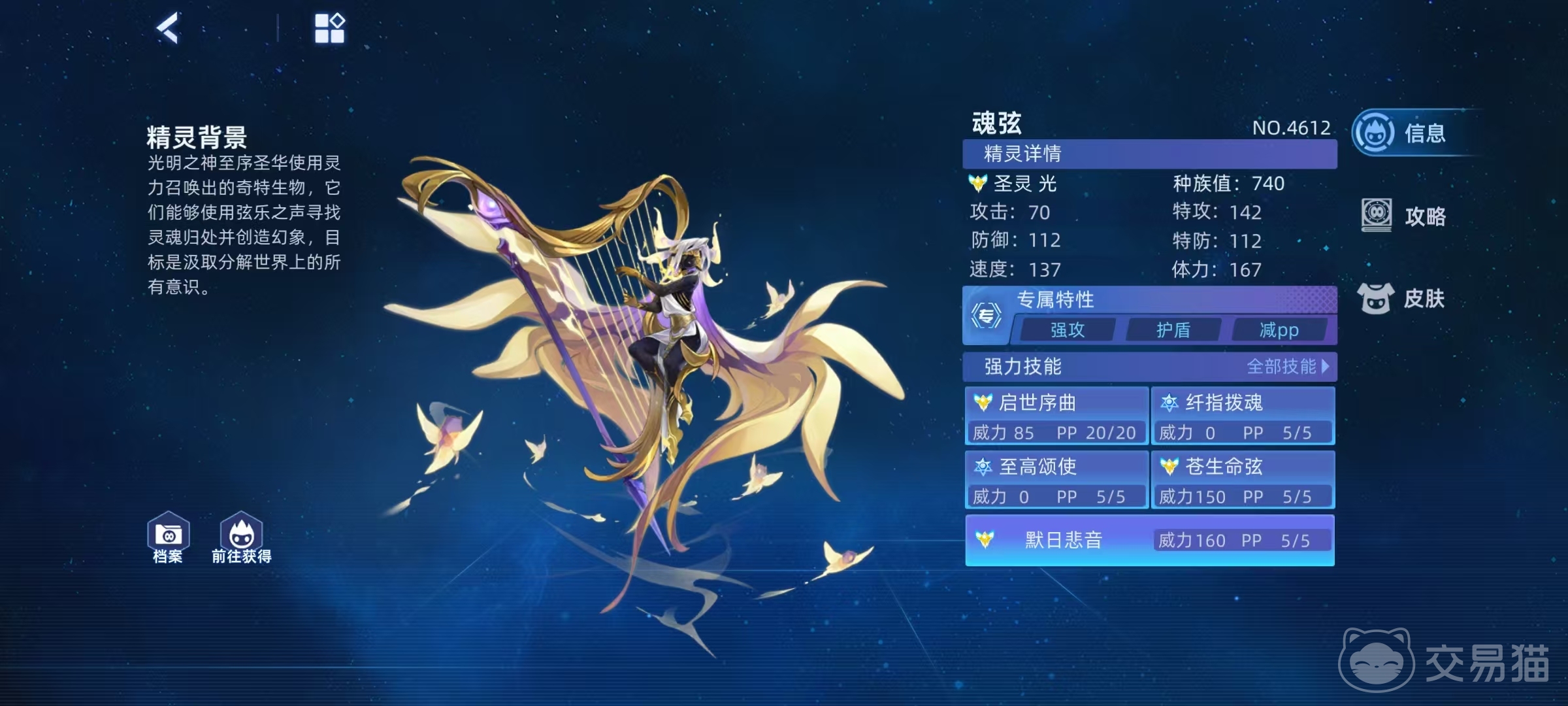 先来看一下自身的基础种族值,魂弦的特攻142,速度137,体力167,这三种属性是比较优秀的,专属特性包括强攻、护盾和减pp等。双方每次使用技能后,自身吸取对手所有技能一点pp值,若自身吸取之后的技能pp值达到满值,则获得300点护盾。回合开始时自身处于能力提升状态,则消除双方身上的能力提升与回合类效果,消除成功任意一项,自身免疫受到的异常状态,自身每带有300点护盾值,造成的攻击伤害提升50%。