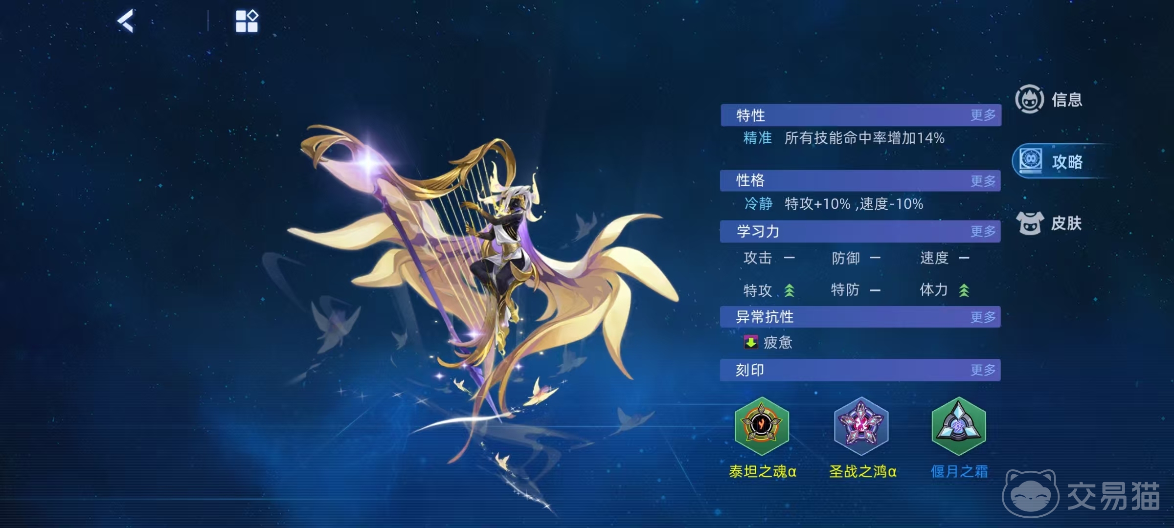 在输出技能方面,最重要的三个是默日悲音、苍生命弦和启世序曲。其中默日悲音威力160,自身存在护盾先制加2,恢复自身体力,附加当前护盾值等量的固定伤害。苍生命弦,消除对手所有的护盾效果,消除成功后自身附加等量护盾,造成伤害低于300可吸取对手1/3最大体力,并为自身附加等量护盾,造成攻击伤害高于300,100%几率令对手疲惫。启示序曲可吸收对手能力提升状态,吸取成功后自身附加300点护盾。