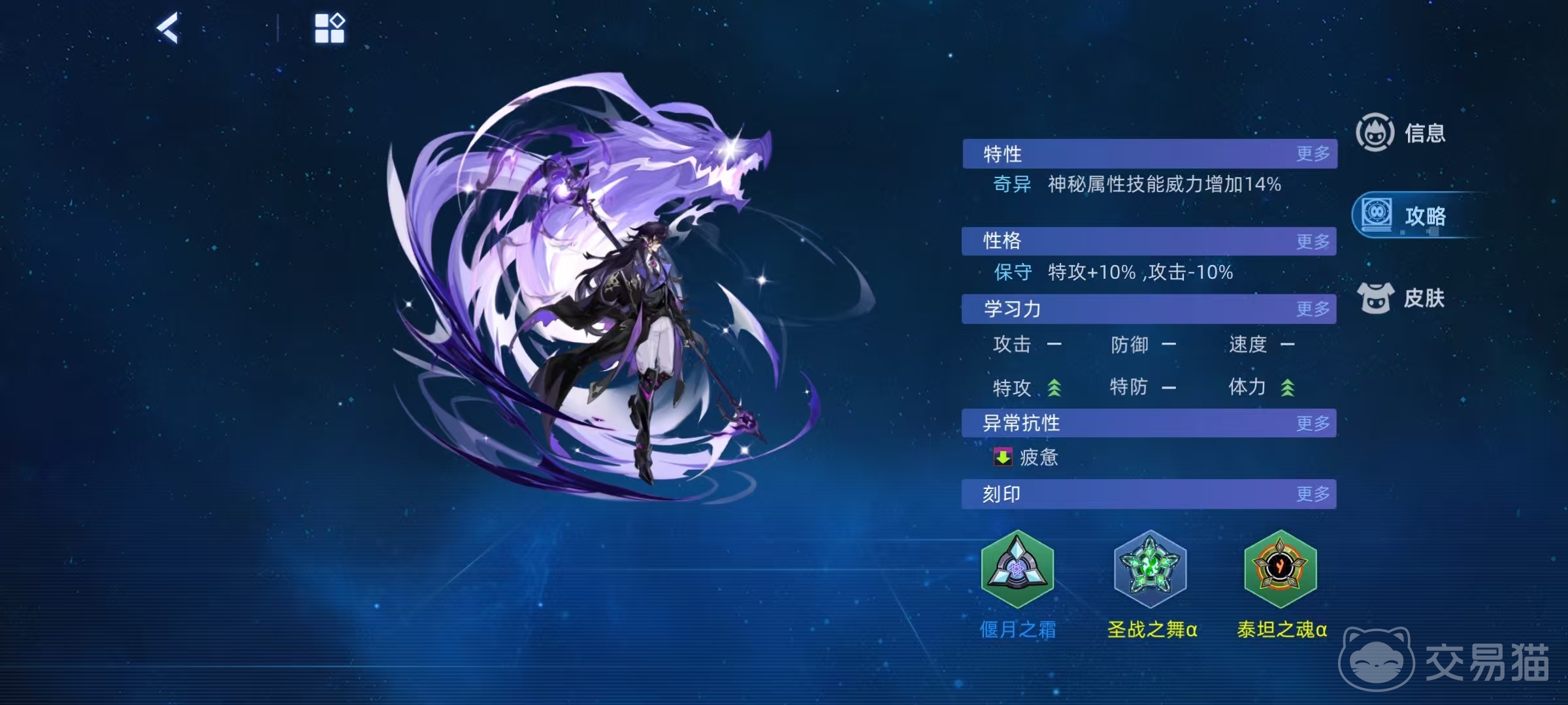 除了输出技能之外,还具有强化技能逆炼幽身,还有防御技能幻蛊销心等,其中逆炼幽身带来全属性提升状态,幻蛊销心则是在四回合内和免疫并反弹受到的异常状态。在性格方面推荐保守,保守带来的10%特攻加成,能够更好地展现技能威力,学习力方面特攻和体力最为重要。