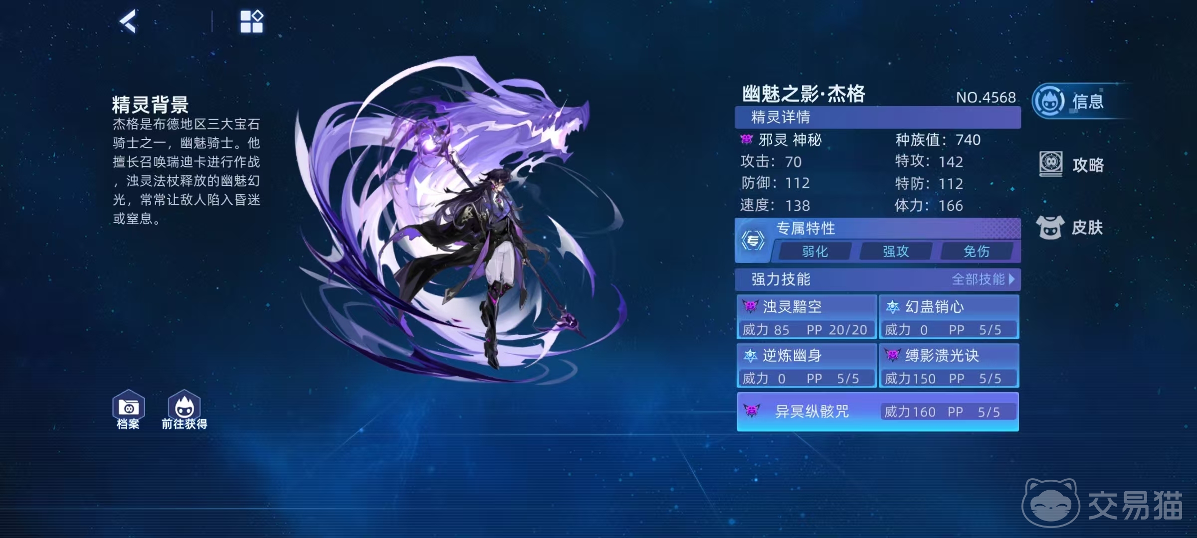 幽魅之影杰格是属于邪灵神秘系的精灵,自身属性方面,体力最为突出为166,特攻142,速度138,这三项属性是比较优秀的,专属特性为弱化,强攻和免伤,在回合开始时,如果自身体力低于对手,则对手全属性降低。如果对手处于能力提升,能力下降等状态时,本回合造成的攻击伤害额外提升。还有在自身受到攻击时,可吸取对手20%的最大体力。受到攻击伤害低于300,效果翻倍,受到攻击伤害高于300,则抵挡下一次受到的攻击。