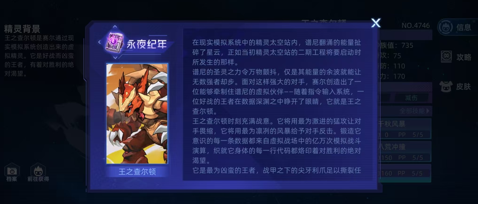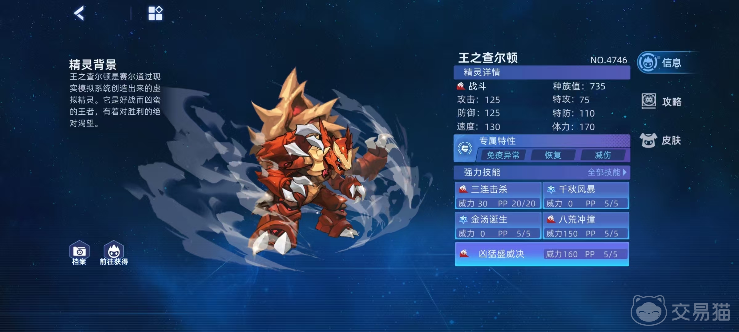 在游戏中,王之查尔顿还是具有一定的特点,尤其是自身在种族值方面体力达到170,这样的体力可以使它有很好的生存能力,速度方面虽然并不算很高,但也达到了130,攻击和防御都是125比较均衡。所具有的专属特性包括免疫异常、恢复和减伤,在自身登场时,如果体力高于对手则免疫受到的异常状态,如果体力低于对手,战斗阶段恢复1/3最大体力。当自身受到攻击伤害时,减少50%,体力每减少10%,效果就减少5%。