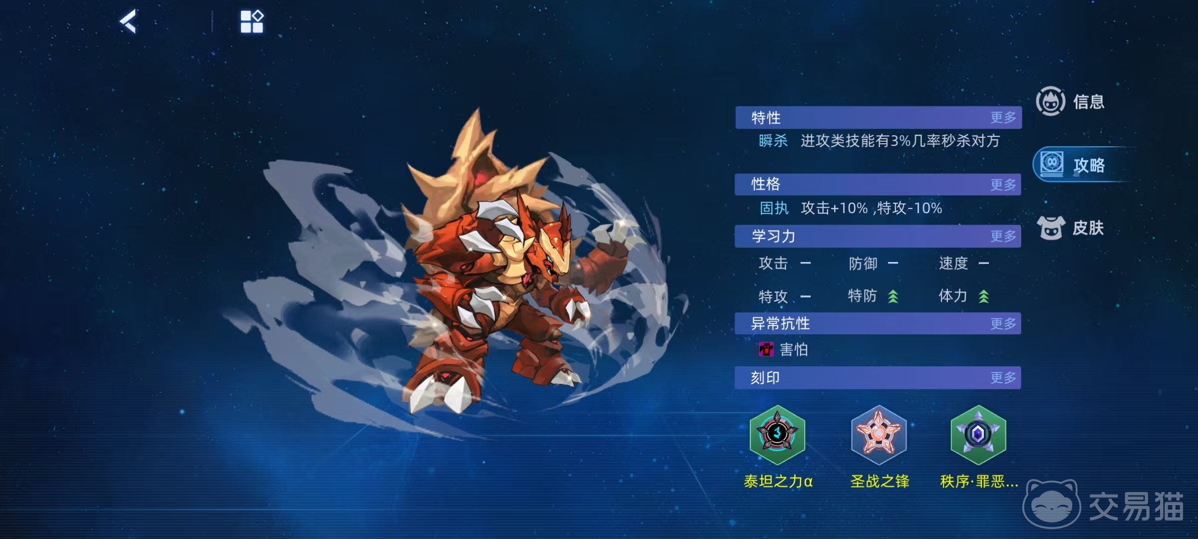 自身主要的强力技能包括三连击杀、千秋风暴、金汤诞生、八荒冲撞、凶猛盛威决等。其中八荒冲撞和凶猛盛威决威力最大,是主要的输出来源。三连击杀可以在一回合内打出多次攻击,并有几率附加固定伤害,金汤诞生为自身提供全属性强化以及护盾效果。这些技能一起叠加起来,可带来比较不错的生存能力,辅助干扰能力以及输出和强化。尤其是金汤诞生技能带来的护盾击破时下次使用附加威力,下两回合造成攻击伤害额外提升,配合八荒冲撞和凶猛盛威决,打出极高的输出。