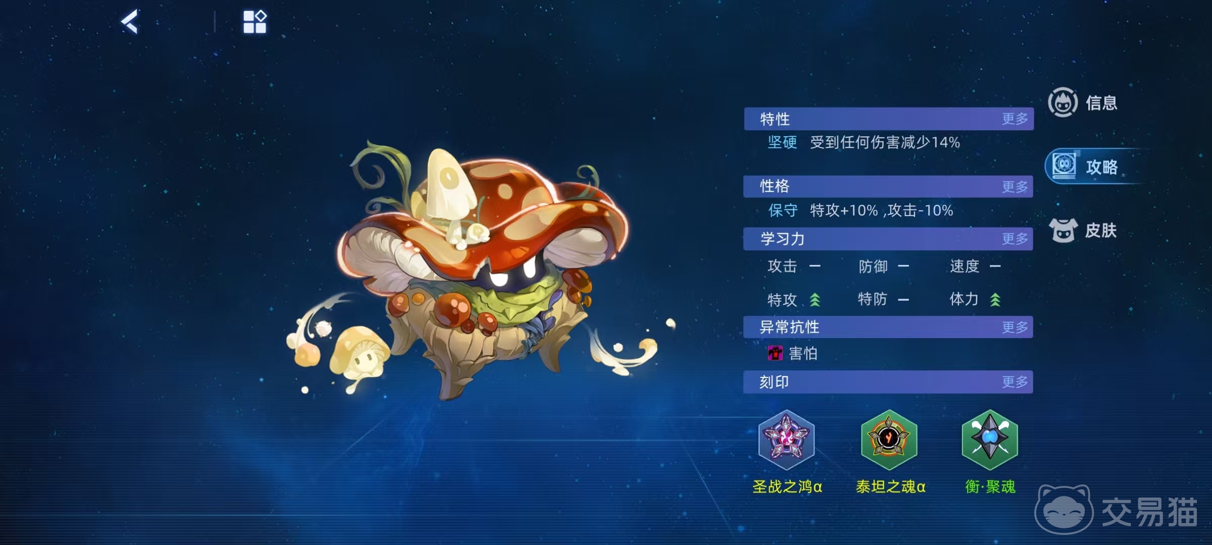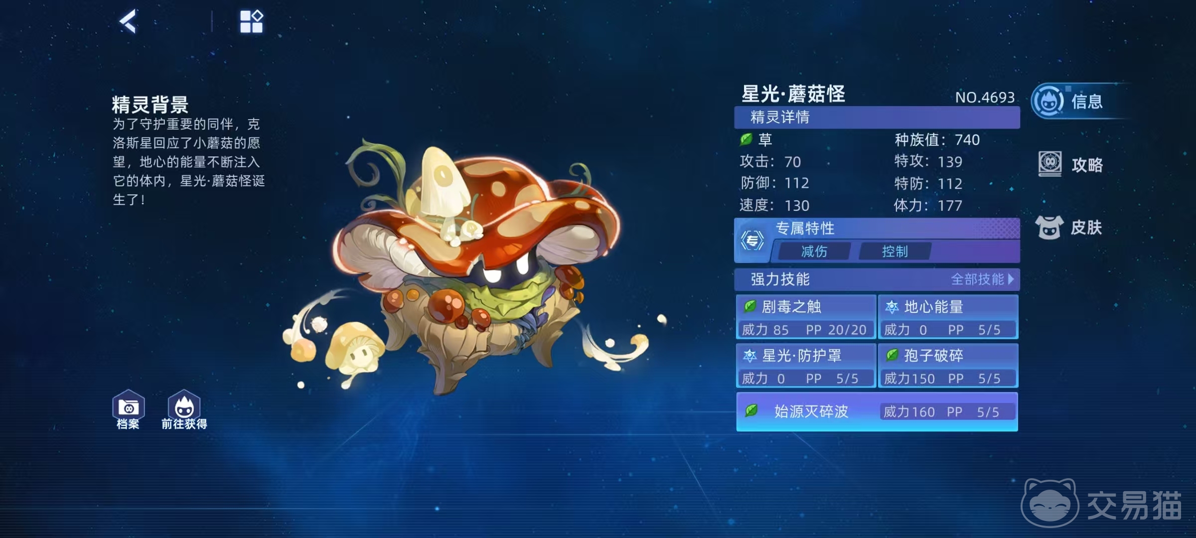 星光蘑菇怪作为草系精灵,它的体力值最为突出,特攻和速度也比较优秀,其他属性一般。专属特性为减伤和控制,首次登场自身免疫下一次对手的攻击,但如果对手使用火系攻击技能,那么是这个效果是失效的。在回合开始的时候,对手每有一种异常状态,那么本回合自身受到的攻击伤害就能减少33%,自身每带有一种异常状态,则可以给对手随机附加一种异常状态。