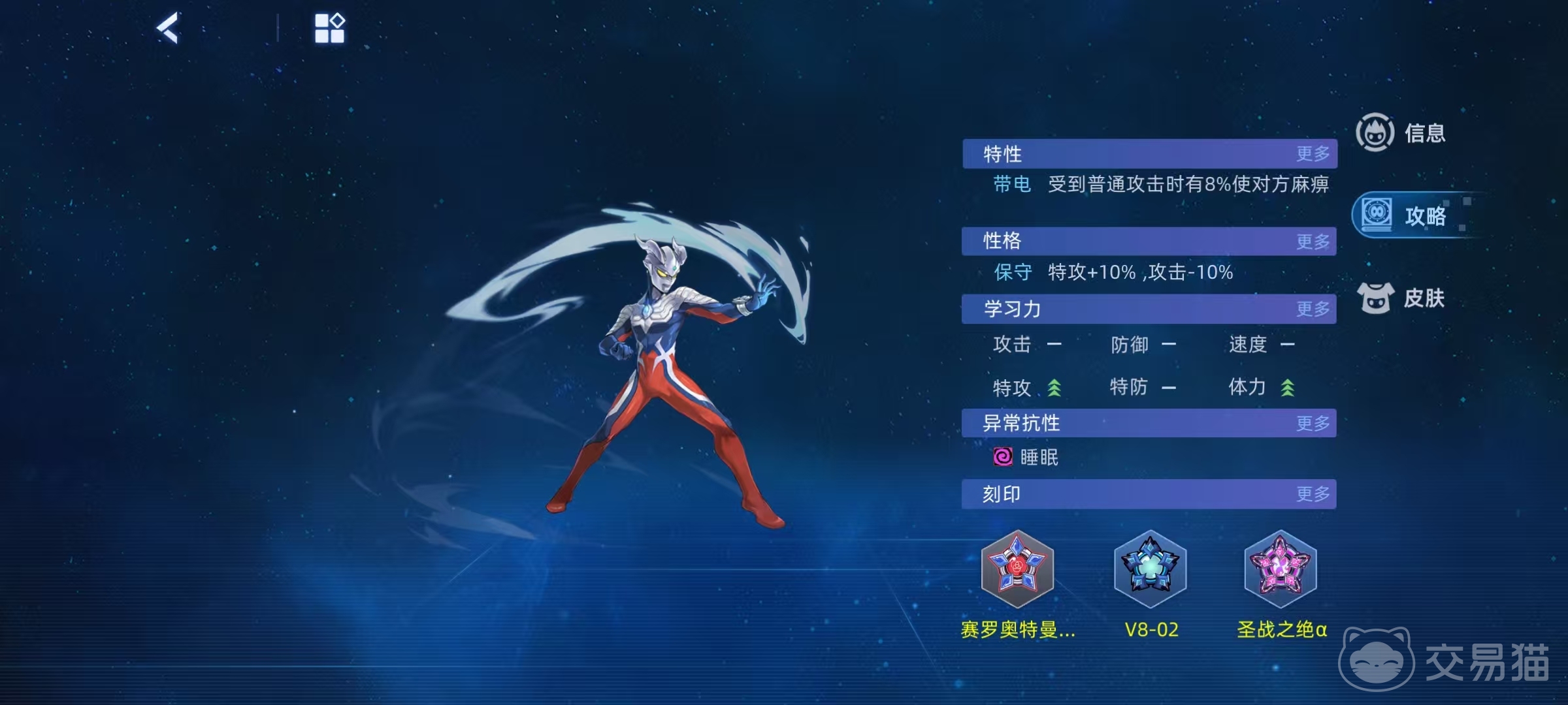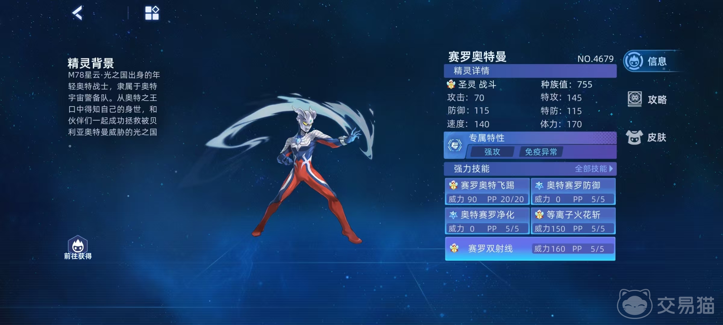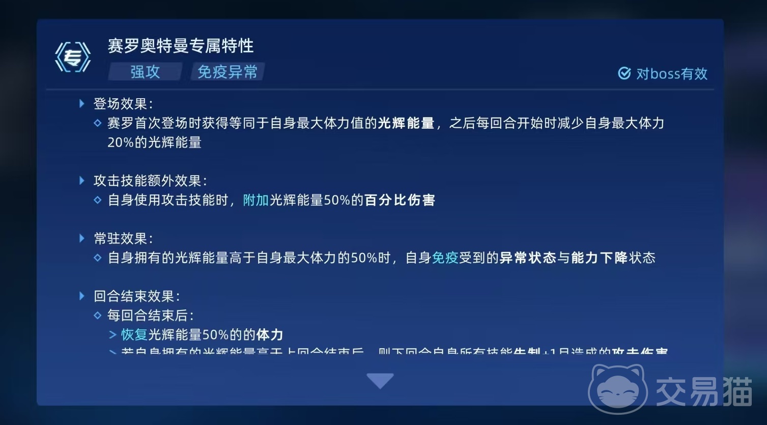 赛罗奥特曼属于圣灵类型的精灵,在种族值方面,特攻和体力都比较出色,速度也很优秀。他的专属特性为强攻和异常免疫,首次登场就可以获得等同于自身最大体力值的光辉能量,之后的每个回合都会按照比例减少。在攻击时,附加光辉能量50%的伤害,每回合结束时,还可按照光辉能量的百分比来恢复体力。