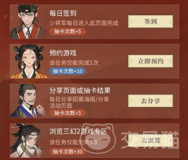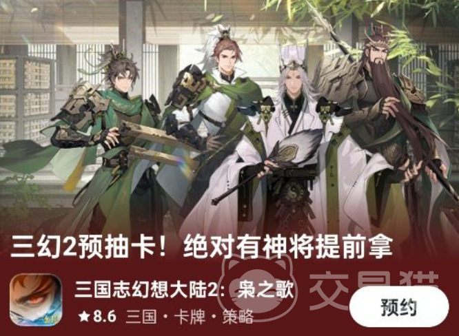 关于三国志幻想大陆2枭之歌预抽卡参与方法与规则就给大家介绍到这里了,可以免费获得1个橙将和4个紫将或者蓝将还是非常棒的,只需简单预约、浏览一下三幻2专区即可获取抽卡次数,大家也一起来试试吧!