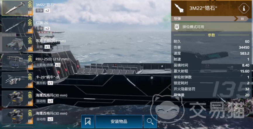 一号导弹槽位采用的是登录签到送的鹰击21,二号槽位用的是40式高超滑翔弹,主炮可以用英炮,也可以用sh16。火箭弹用的是Rbu-10000,很适合用来刷人机。